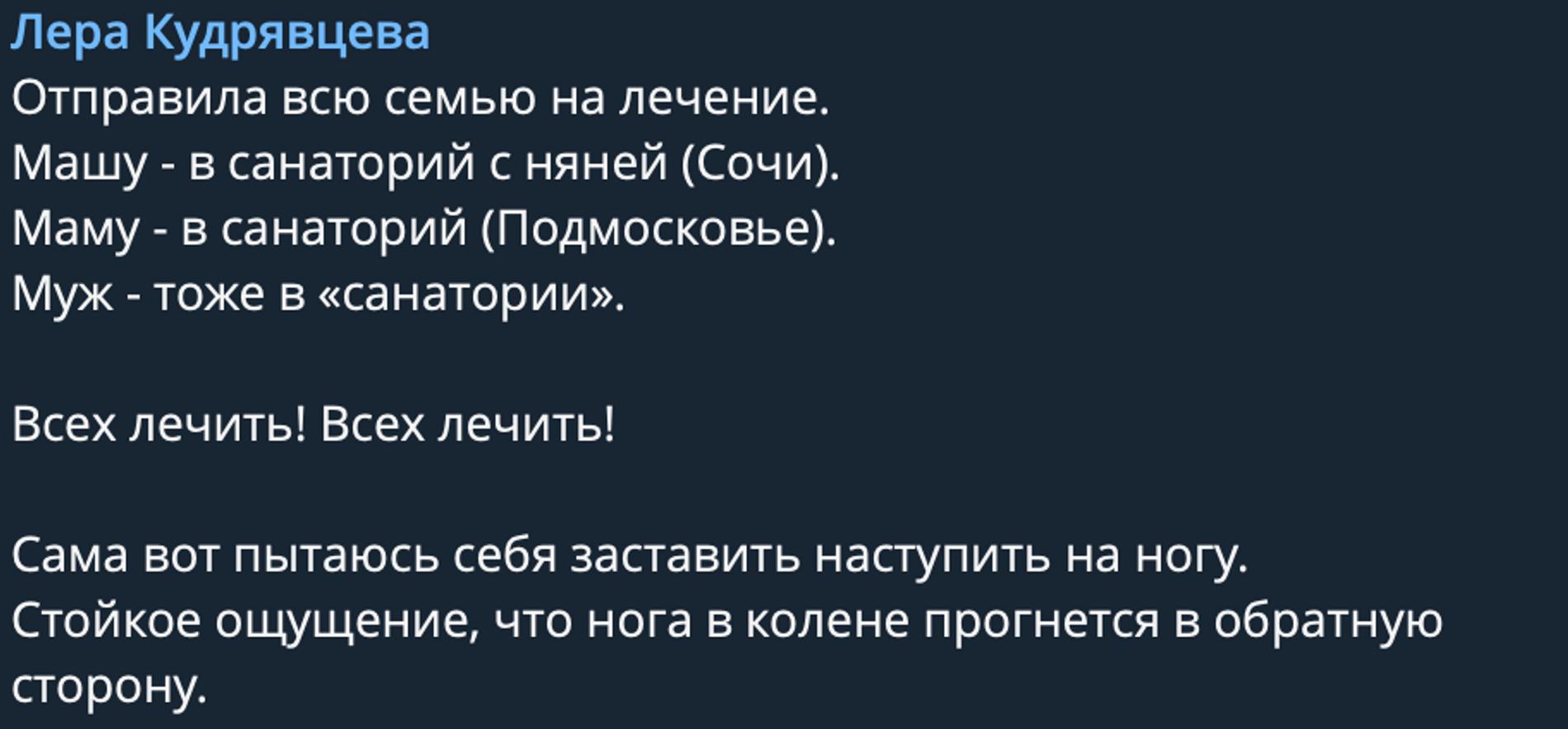 Лера Кудрявцева сообщила, что с ее легкой руки все члены семьи в данный момент оздоравливаются, но порознь. «Отправила всю семью на лечение. Машу — в санаторий с няней (Сочи). Маму — в санаторий (Подмосковье). Муж тоже в «санатории». Всех лечить! Всех лечить!» — рассказала телезвезда. При этом, как известно, сама Лера сейчас тоже нуждается в лечении и восстановлении. На днях она перенесла операцию после жуткого перелома ноги. «Сама вот пытаюсь себя заставить наступить на ногу. Стойкое ощущение, что нога в колене прогнется в обратную сторону», — поделилась телеведущая.