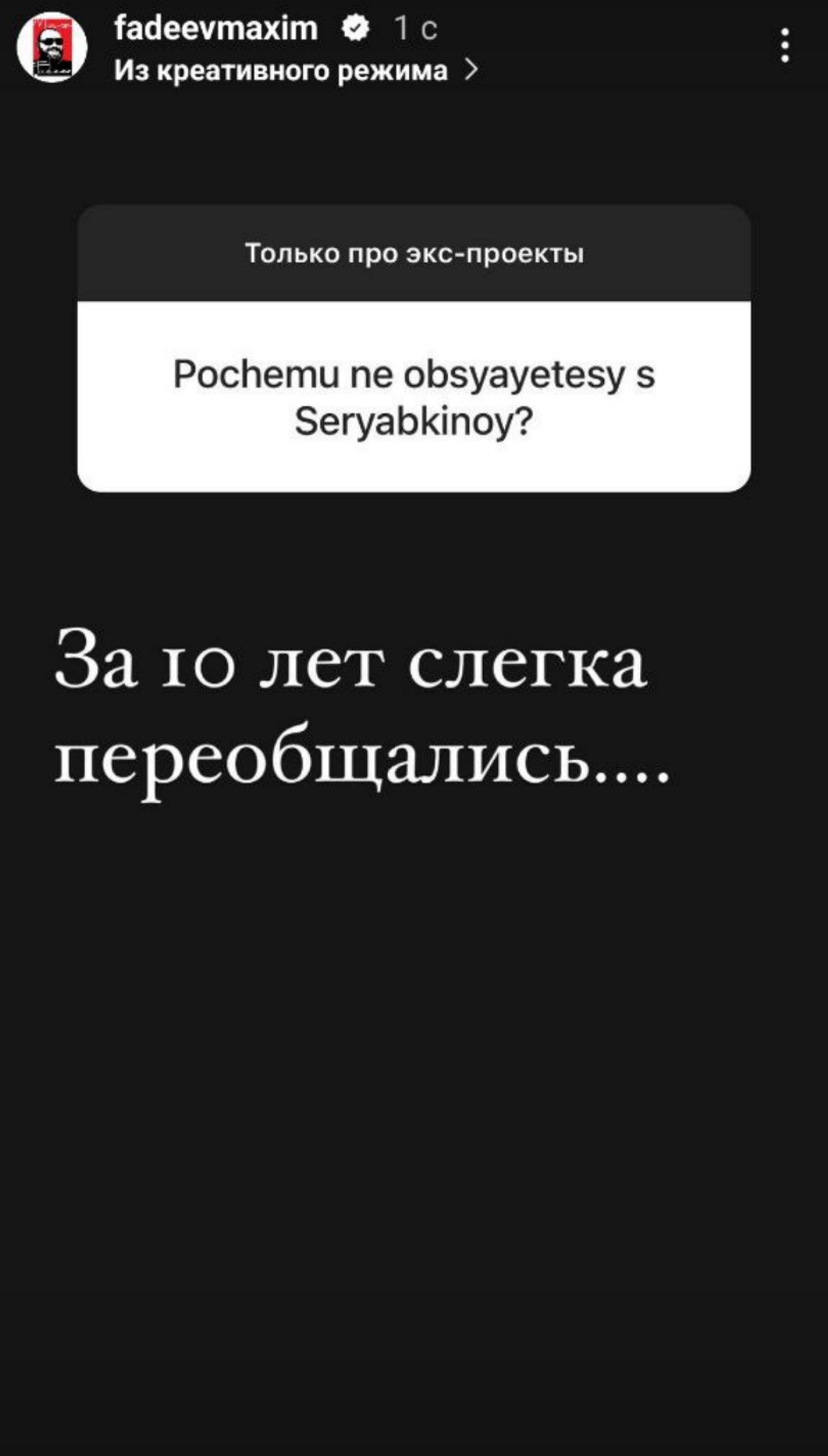 К слову, в настоящее время Максим Фадеев не общается с Ольгой Серябкиной. В сторис продюсер объяснил почему. «За 10 лет слегка переобщались», — неоднозначно ответил Фадеев, поставив при этом красноречивое многоточие.