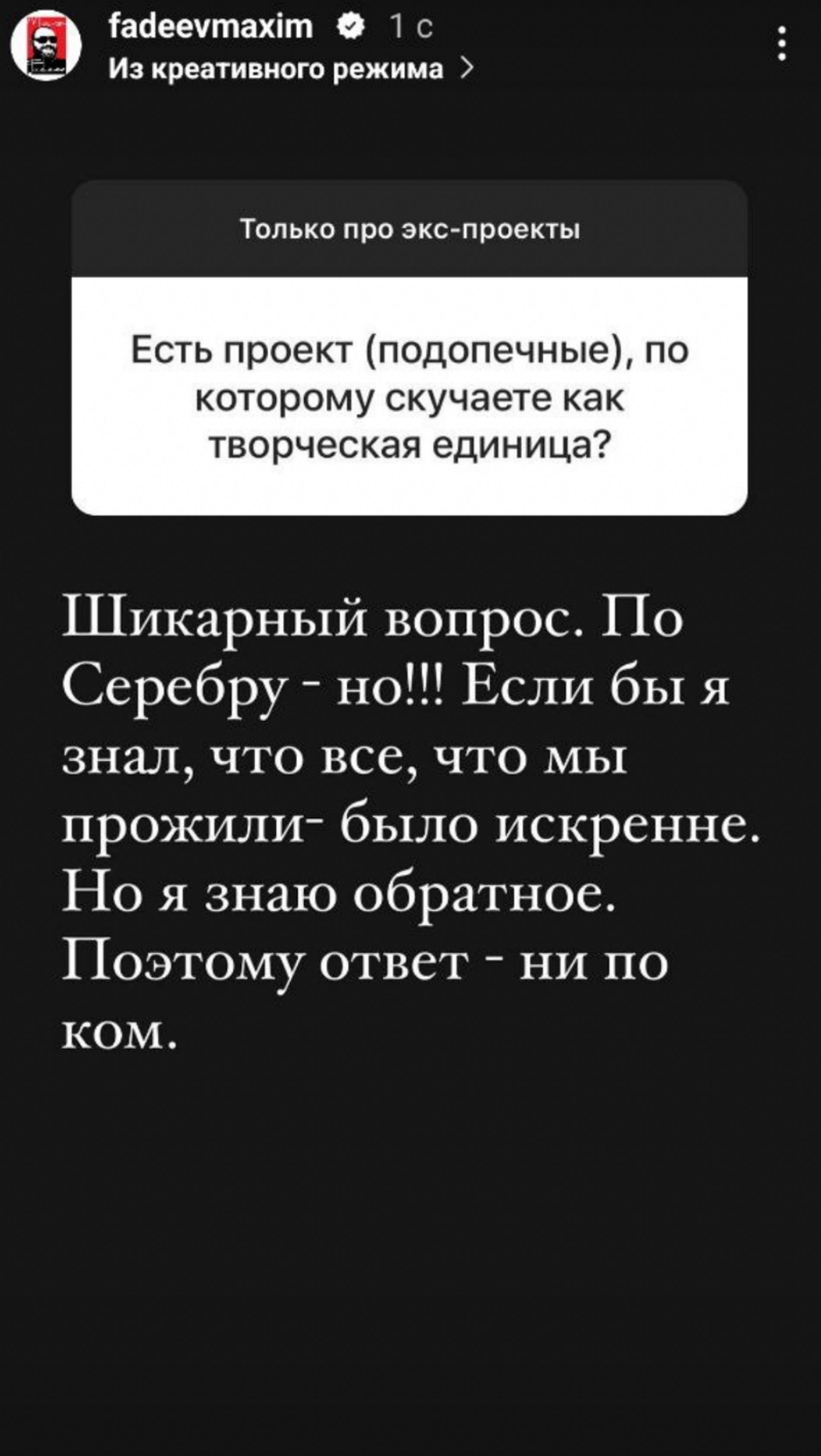 На когда у Максима спросили, по какому из своих проектов и подопечных он скучает, продюсер сказал, что ответил бы, что по группе Serebro, но только лишь в одном случае, если бы знал: «Все, что мы пережили, было искренне». «Но я знаю обратное. Поэтому ответ: ни по кому», — сказал как отрезал продюсер.