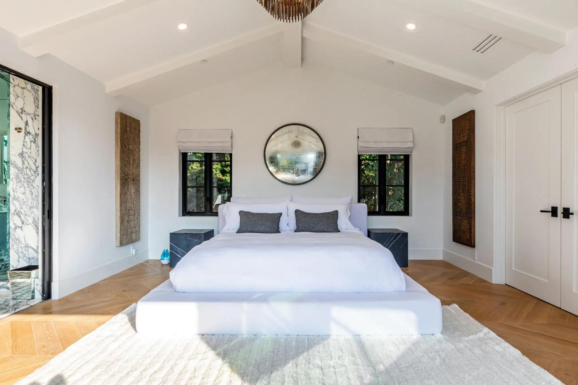Почти в каждой комнате есть большие панорамные окна, поэтому поужинать, почиллить на диване в гостиной, отдохнуть в одной из пяти спален и даже принять ванну можно с видом на внутренний двор. Честно говоря, для такой колоритной парочки дом кажется даже слишком спокойным и сдержанным: в интерьере преобладают белый цвет и другие нейтральные тона — коричневый, серый и черный. Единственная комната, которая выделяется яркими обоями с зелеными листьями, — очевидно детская.