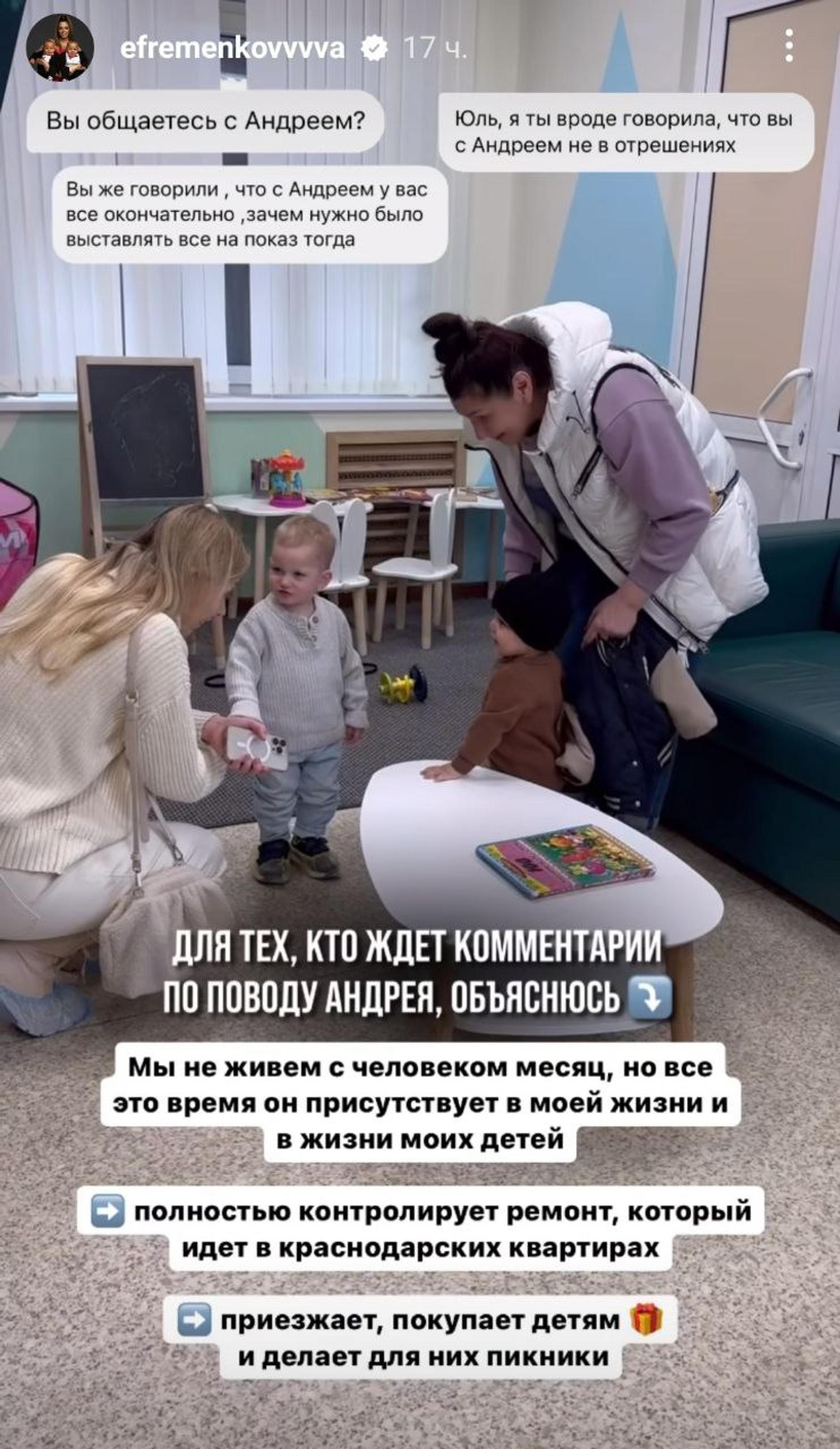 Такого поворота подписчики Ефременковой не ожидали — ведь до этого она писала про экс-возлюбленного, что не собирается терпеть недостойное к себе отношение и вообще им не по пути. На вопросы фолловеров девушка ответила, что действительно рассталась с мужчиной, но он до сих пор принимает активное участие в ее жизни: контролирует процесс ремонта, который идет в ее квартирах в Краснодаре, а также регулярно видится с Кристианом и Даниэлем.