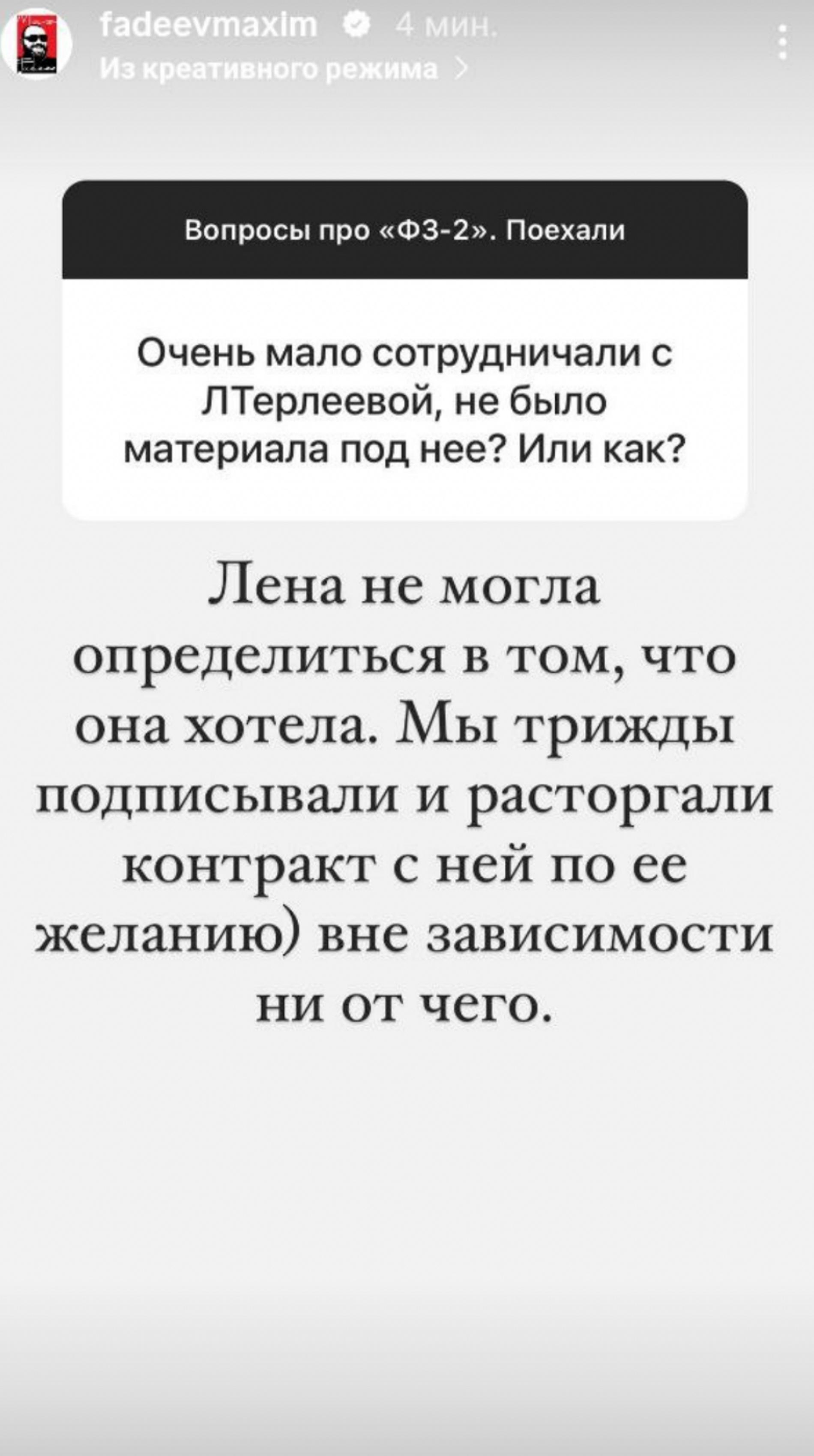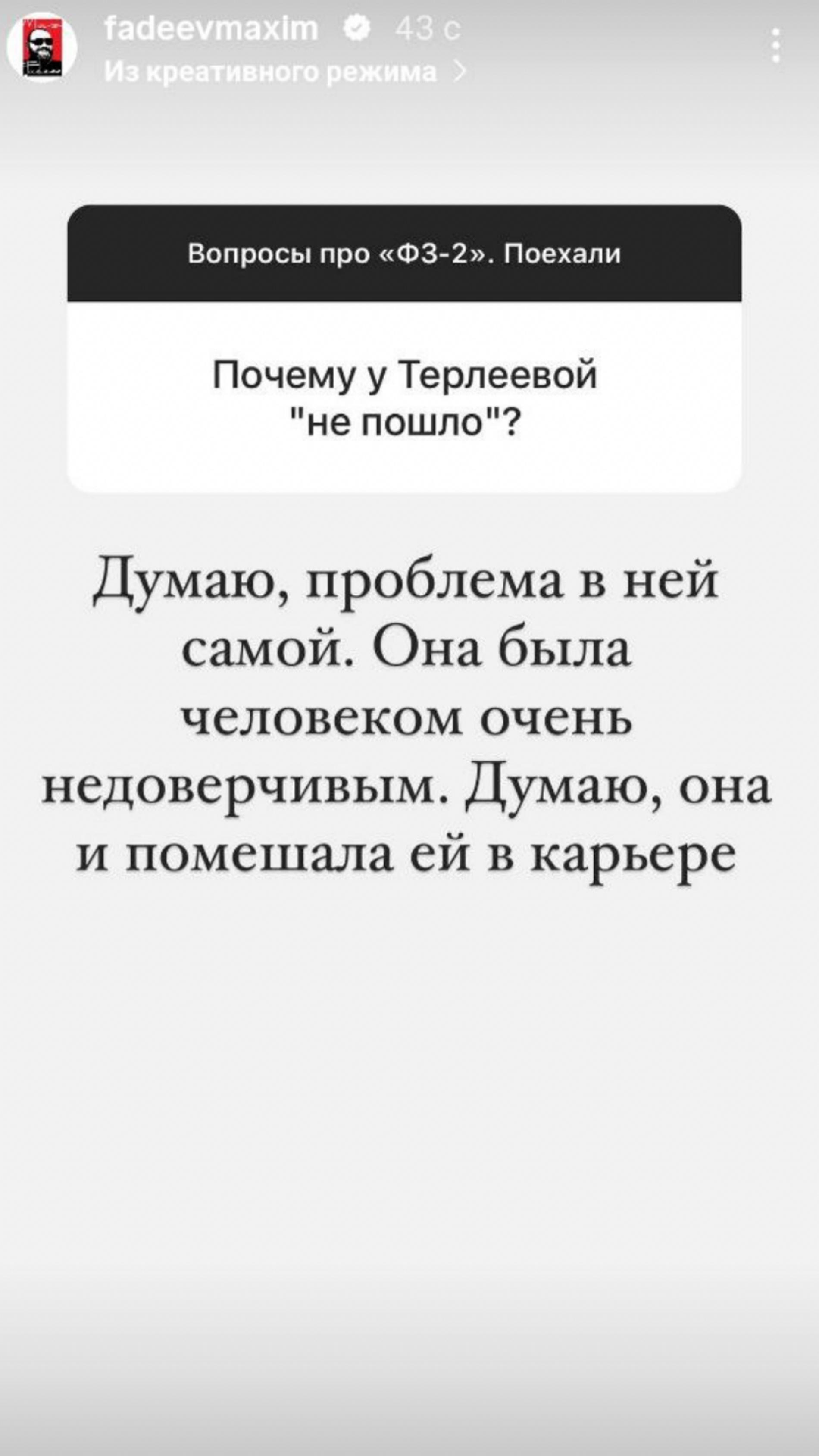 «Думаю, проблема в ней самой. Она была человеком очень недоверчивым. Думаю, это и помешало ей в карьере», — разоткровенничался продюсер в запрещенной сети. «Лена не могла определиться в том, что она хотела. Мы трижды подписывали и расторгали контракт с ней по ее желанию. Вне зависимости ни от чего», — раскрыл подробности недолгого сотрудничества с Терлеевой Фадеев.