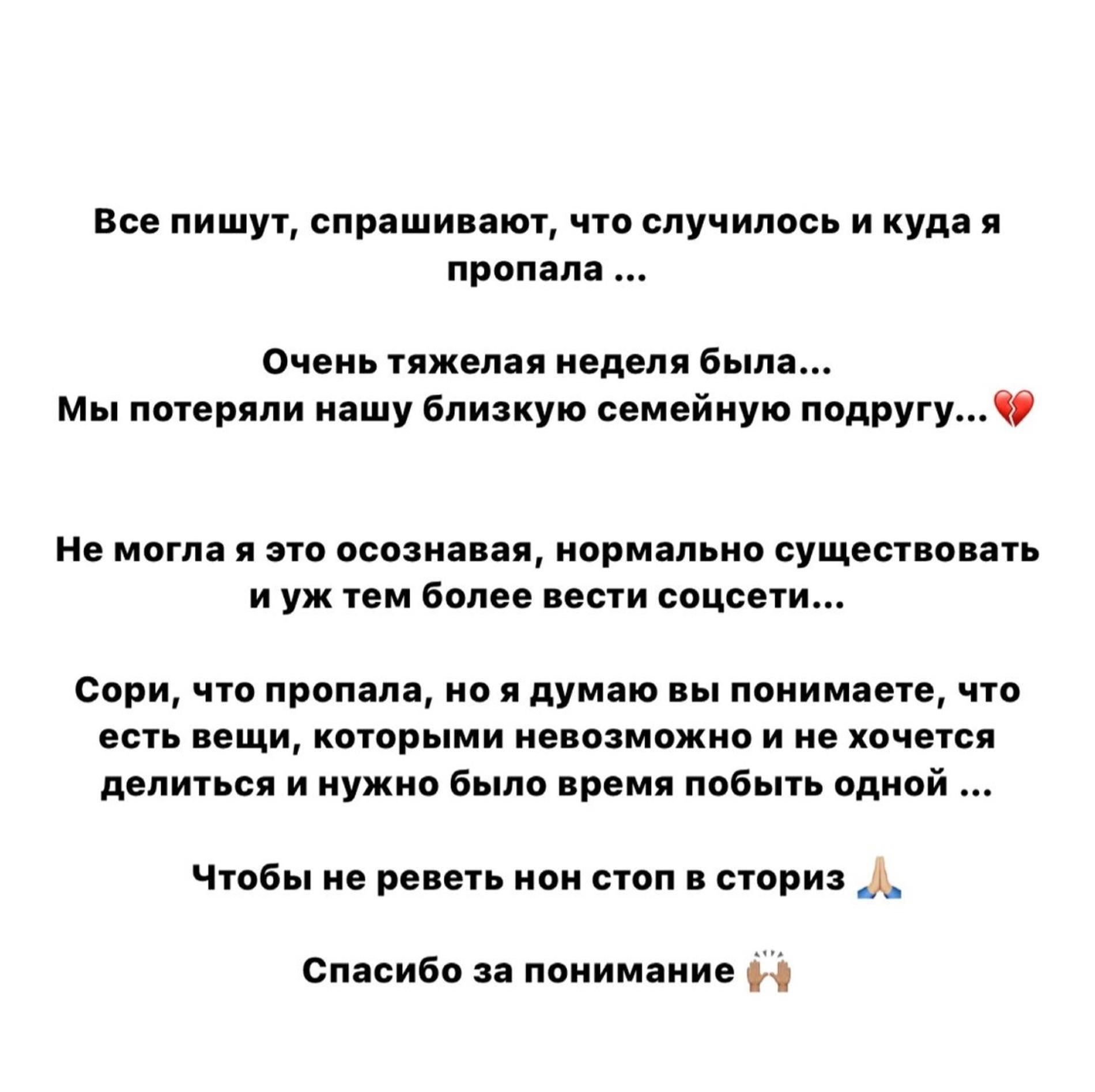 «Все пишут, спрашивают, что случилось и куда я пропала… Очень тяжелая неделя была… Мы потеряли нашу близкую семейную подругу… Не могла я, это осознавая, нормально существовать и уж тем более вести соцсети», — призналась певица.