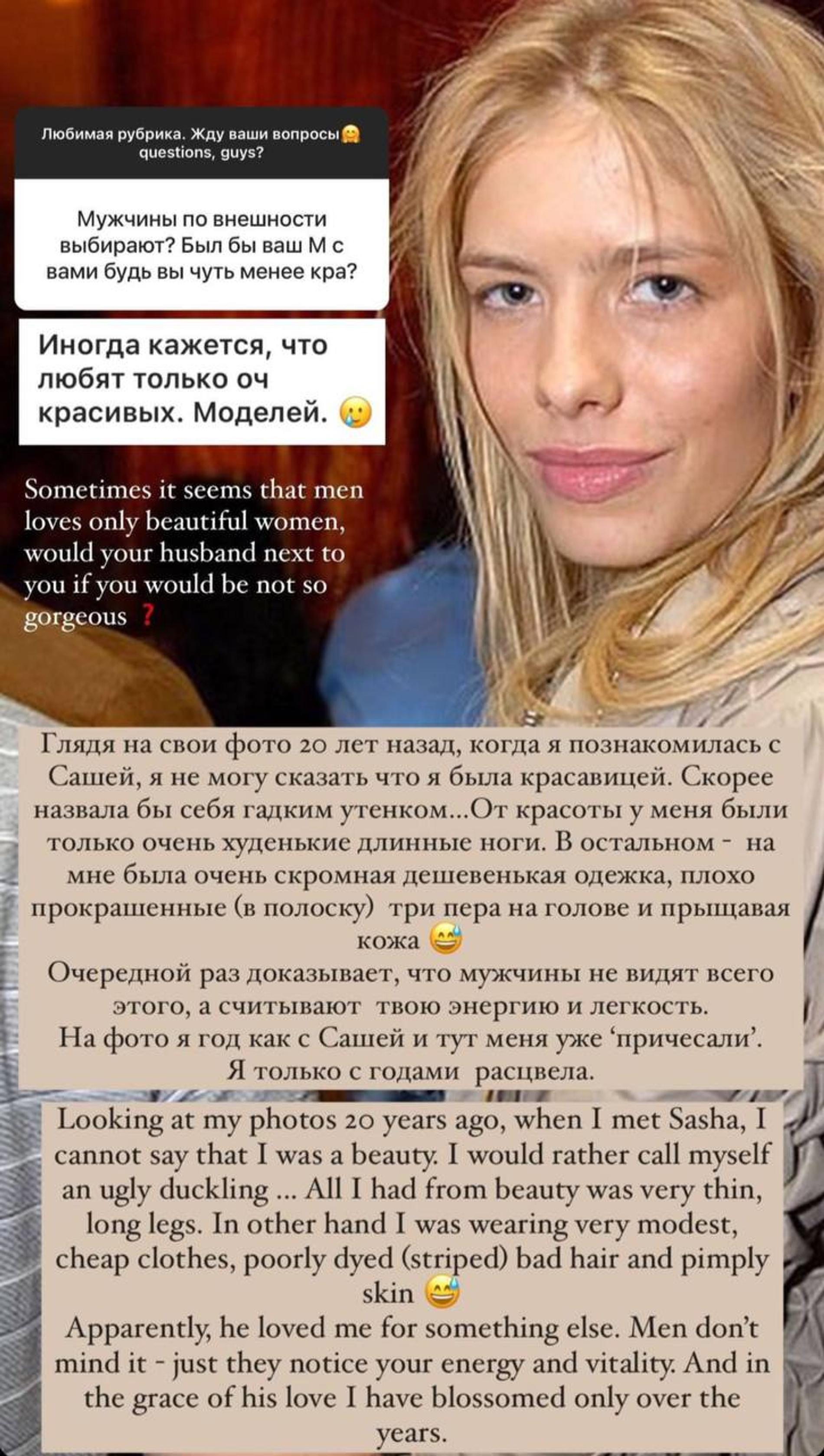 Модель заявила, что не считала себя красавицей 20 лет назад, когда познакомилась с будущим мужем. «Скорее я назвала бы себя гадким утенком. От красоты у меня были только очень худенькие длинные ноги, — высказалась Елена. — В остальном — на мне была очень скромная дешевенькая одежка, плохо покрашенные (в полоску) три пера на голове и прыщавая кожа». Снимок того периода звезда то ли не нашла в архивах, то ли постеснялась публиковать, и поделилась кадром, когда только-только начала отношения с Александром. «Тут меня уже причесали», — пояснила она.