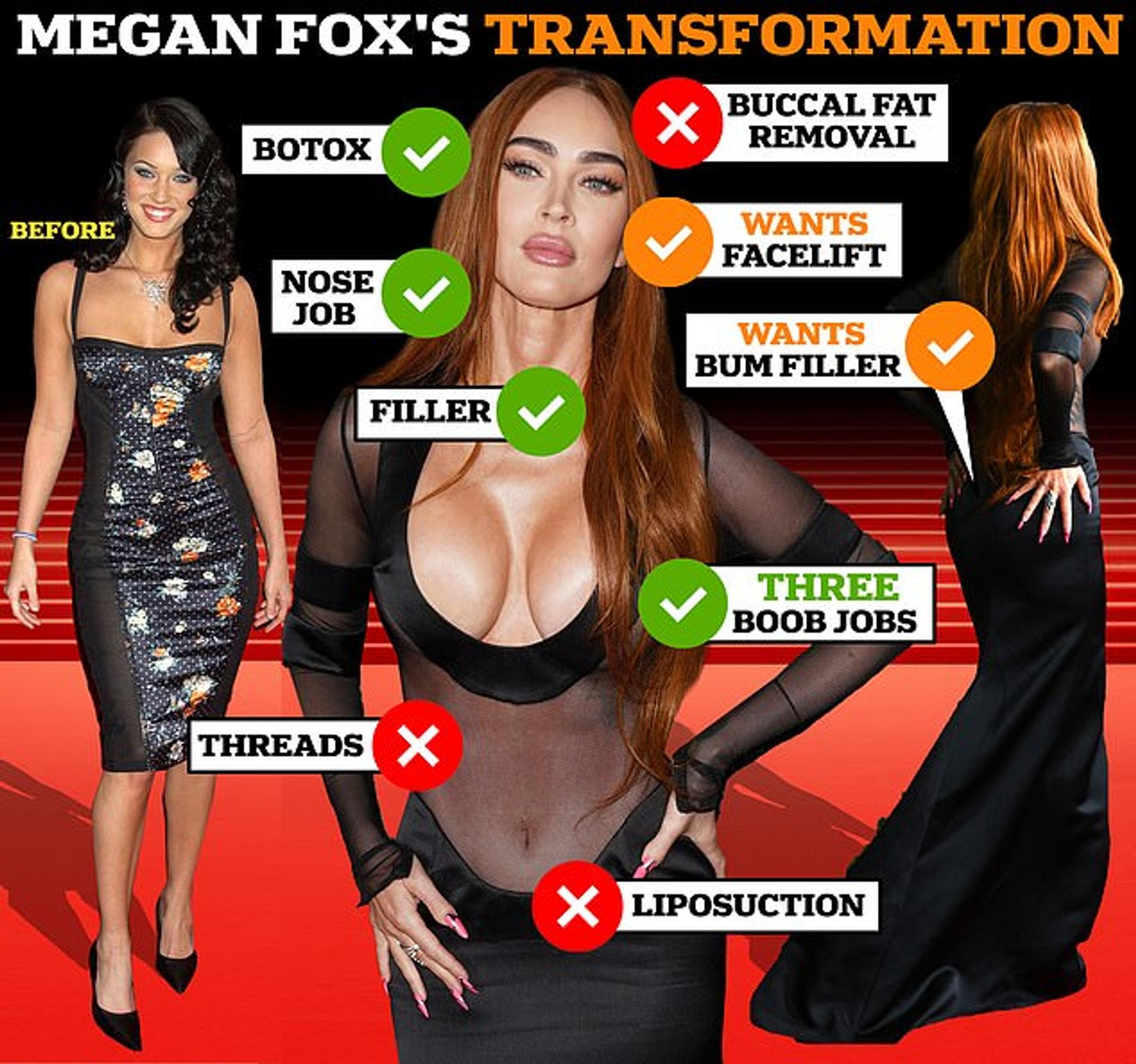 Слухи о том, что Меган Фокс захаживает в клинику пластической хирургии, ходили давно. Но недавно сомнения общественности развеял специалист, который внимательно изучил снимки звезды с «Суперкубка» и подтвердил: изменения во внешности актрисы не связаны с естественными причинами. После этого Меган, прежде игнорировавшей любые комментарии о своих трансформациях, пришлось сознаться: на ее счету не одна трансформация.