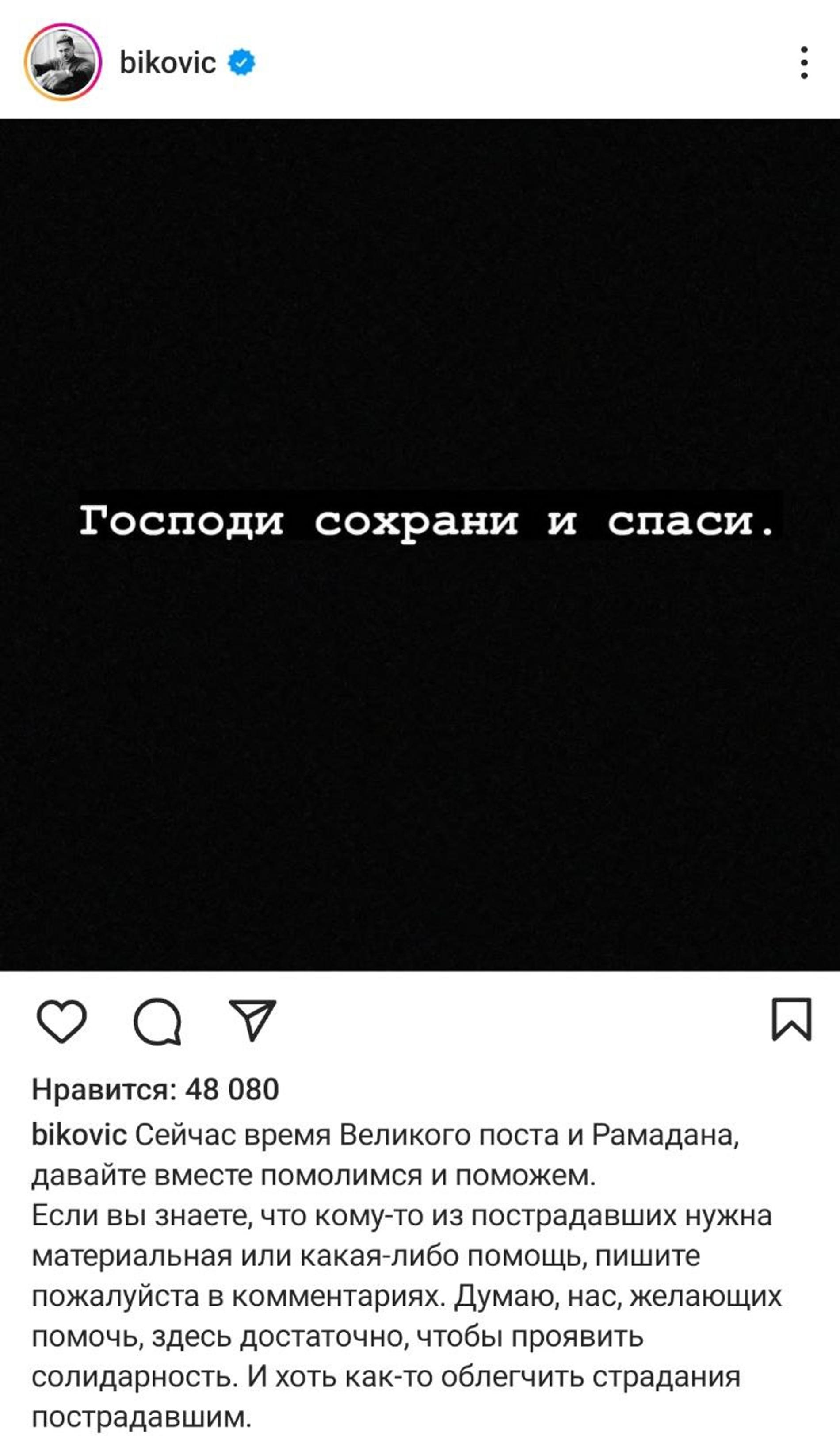 Популярный в России актер сербского происхождения Милош Бикович тоже не остался в стороне и попросил подписчиков делиться в комментариях под его постом в Инстаграме** контактами тех, кому нужна материальная или какая-либо другая помощь.