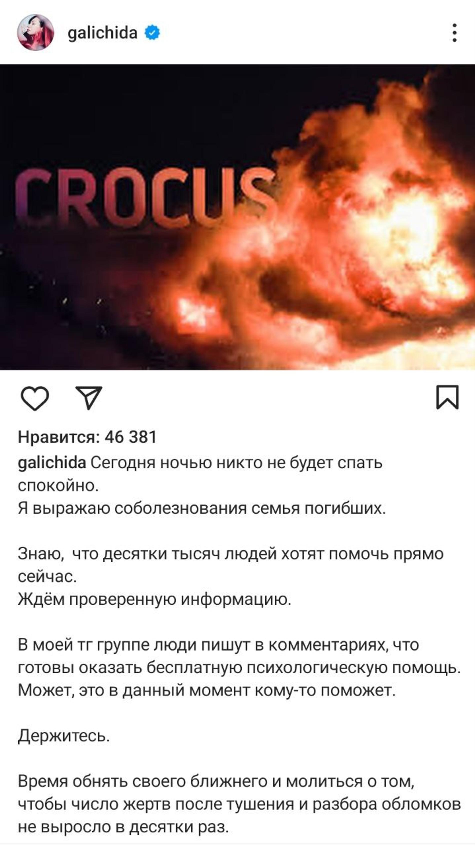 Страшная новость о теракте в подмосковном «Крокус Сити Холле» не оставила равнодушным никого. Вся страна скорбит вместе с семьями погибших и пострадавших — и звезды российского шоу-бизнеса не исключение.