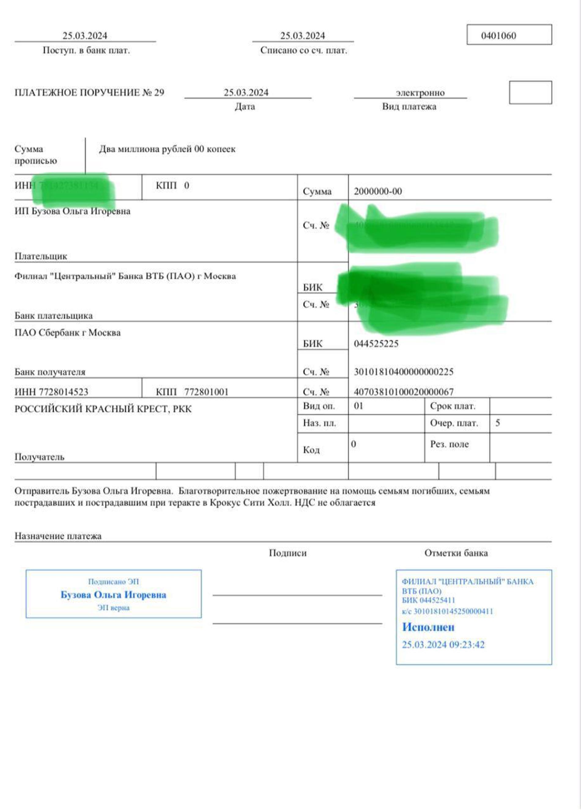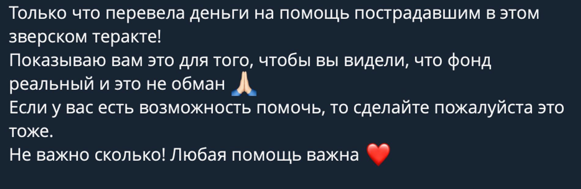 «Только что перевела деньги на помощь пострадавшим в этом зверском теракте! Показываю вам это для того, чтобы вы видели, что фонд реальный и это не обман. Если у вас есть возможность помочь, то сделайте, пожалуйста, это тоже. Неважно сколько! Любая помощь важна», — написала Ольга Бузова в своем Telegram-канале и прикрепила скрины подтверждающих документов.