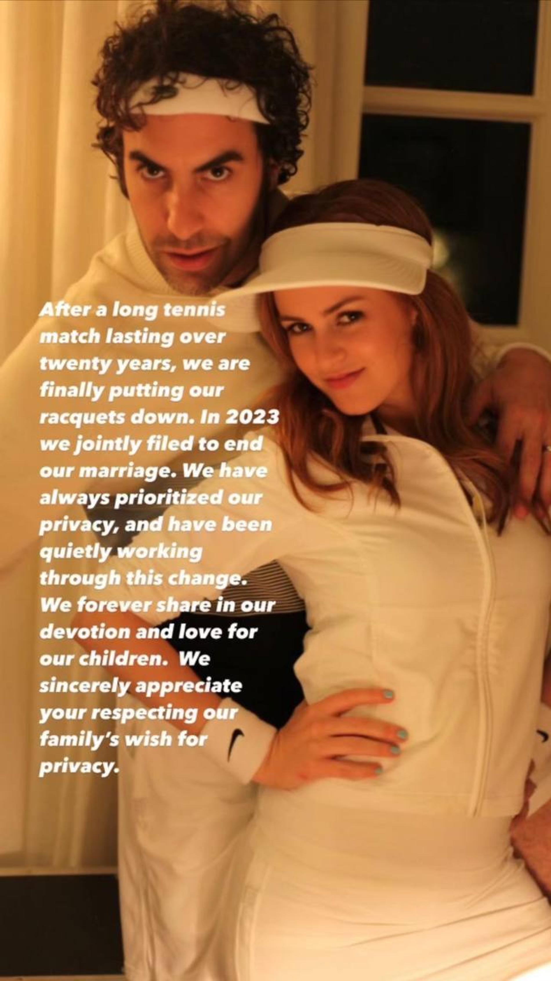 Распалась одна из самых крепких и непубличных голливудских пар: эпатажный комик Саша Барон Коэн и актриса Айла Фишер объявили о разводе после 13 лет брака. Звезды опубликовали официальное заявление, в котором, на первый взгляд, нет ни малейшего намека на скандал. «После долгого теннисного матча, который длился более двадцати лет, мы наконец откладываем ракетки. В 2023 году мы совместно подали заявление о расторжении нашего брака», — говорится в обращении.