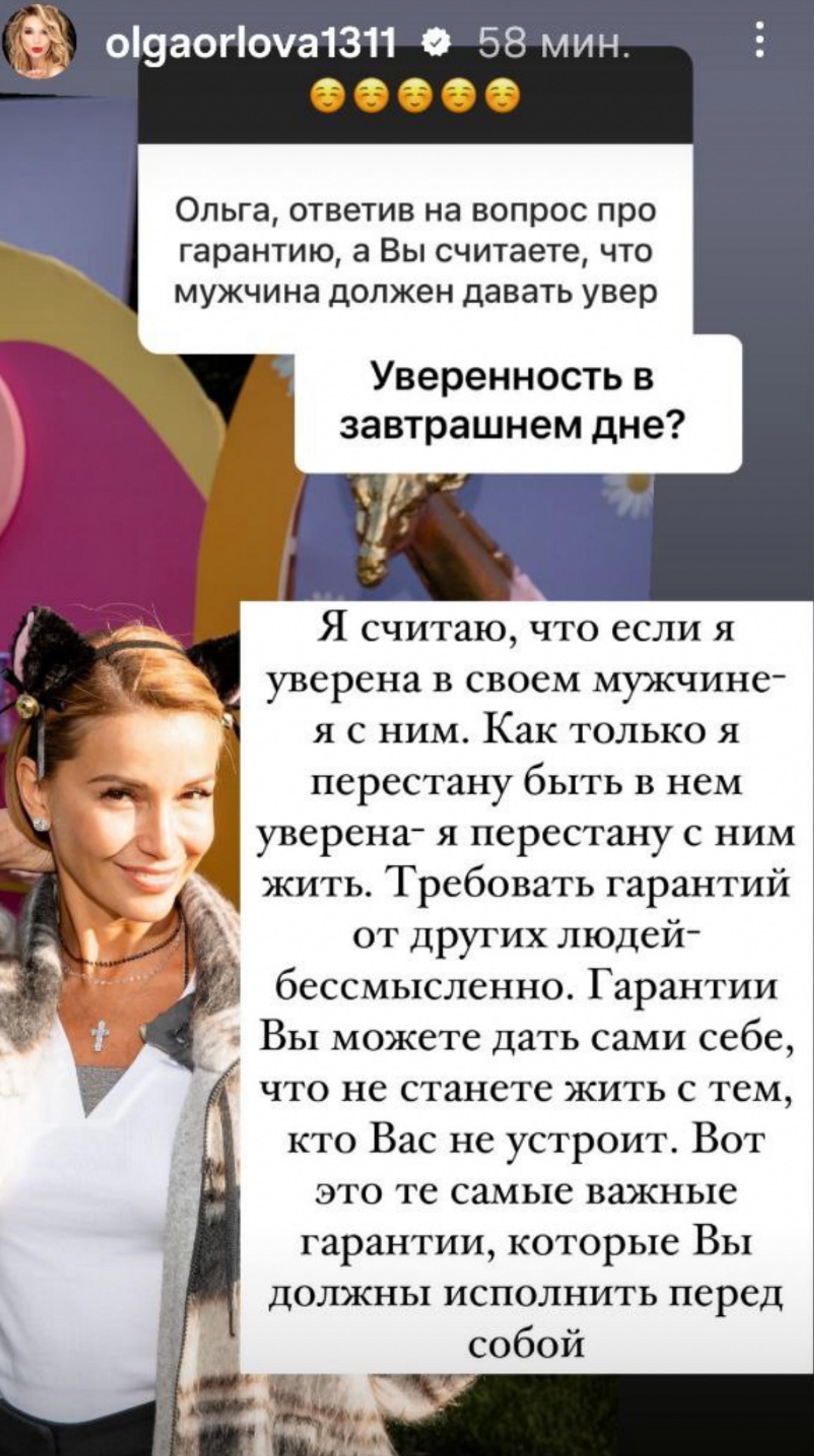 Сторис Ольги Орловой — кладезь мудрых мыслей и советов на тему отношений между мужчиной и женщиной. Лично мы по выходным, когда у звезды выходит рубрика «Вопрос-ответ», регулярно скриним ответы телеведущей. И, кажется, вот-вот начнем их сами задавать. Но пока этого не происходит, изучаем, чем интересуются другие и что на это отвечает Ольга. Так, в минувший уикенд подписчики затронули тему уверенности в завтрашнем дне и должен ли ее гарантировать женщине мужчина?