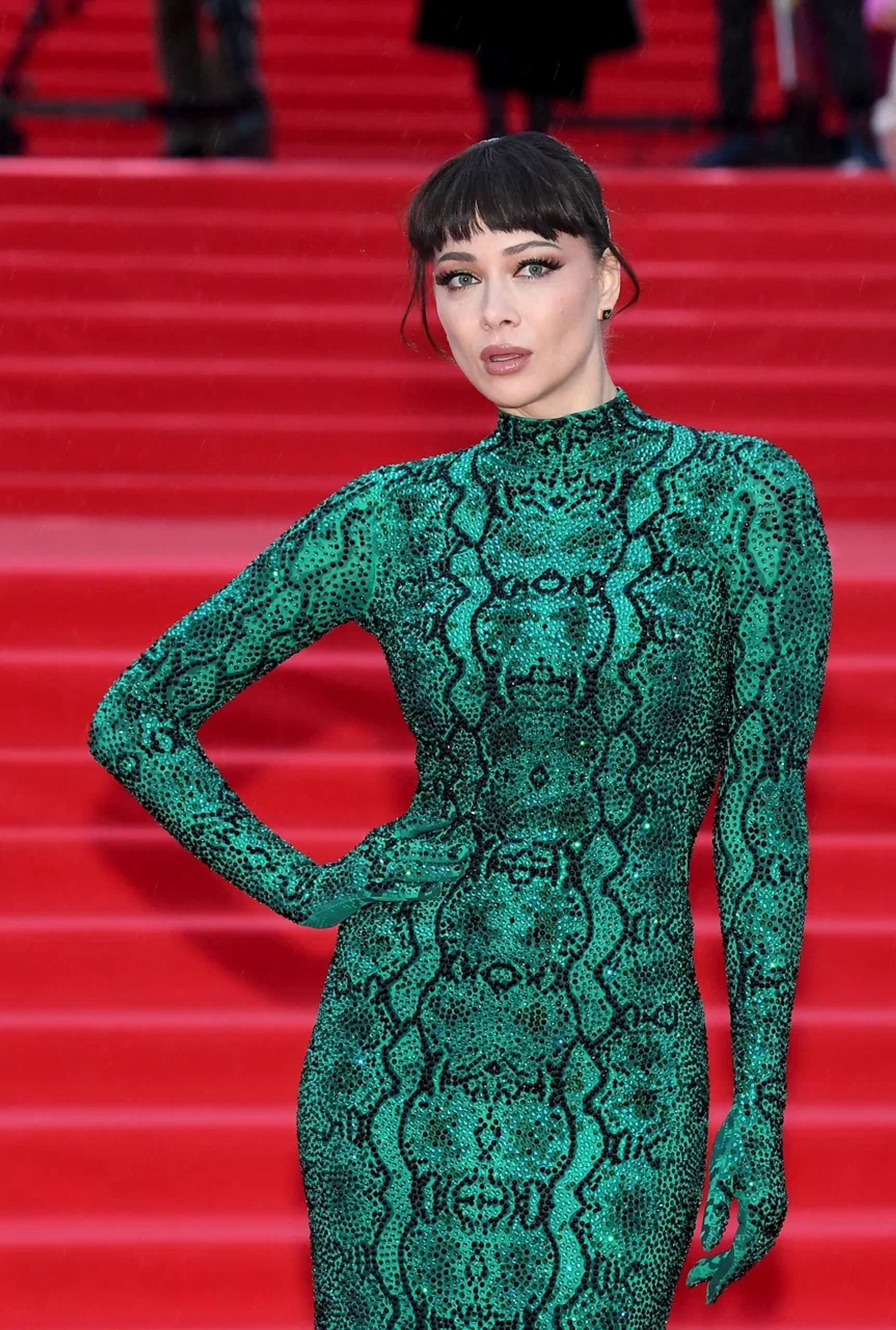 Роковая красотка Настасья Самбурская от темных цветов сегодня отказалась. Длинное «змеиное» платье актрисы закрывало даже кисти, при этом выглядела она, признаться, эротично. Вдобавок от вспышек камер буквально блистала.
