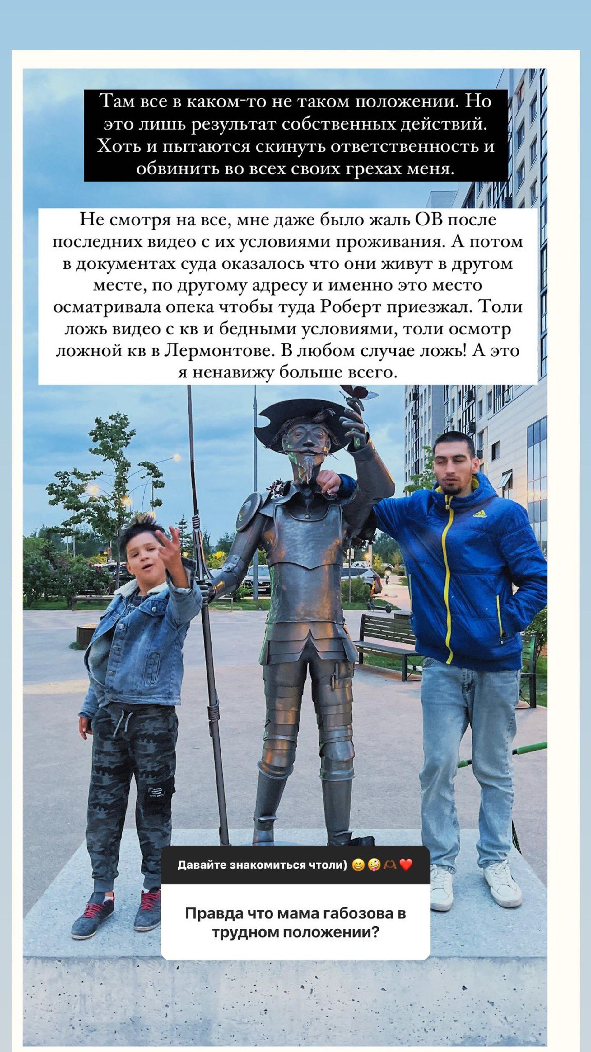 «Несмотря на все, мне было даже было жаль Ольгу Васильевну (мама Александра Гобозова. — Прим. Super) после последних видео с их условиями проживания. А потом в документах суда оказалось, что они живут в другом месте, по другому адресу и именно это месте осматривала опека, чтобы туда Роберт приезжал. То ли ложь видео с квартирой и бедными условиями, то ли осмотр ложной квартиры в Лермонтове. В любом случае ложь! А это я ненавижу больше всего», — написала накануне Устиненко в сторис в Инстаграме*.