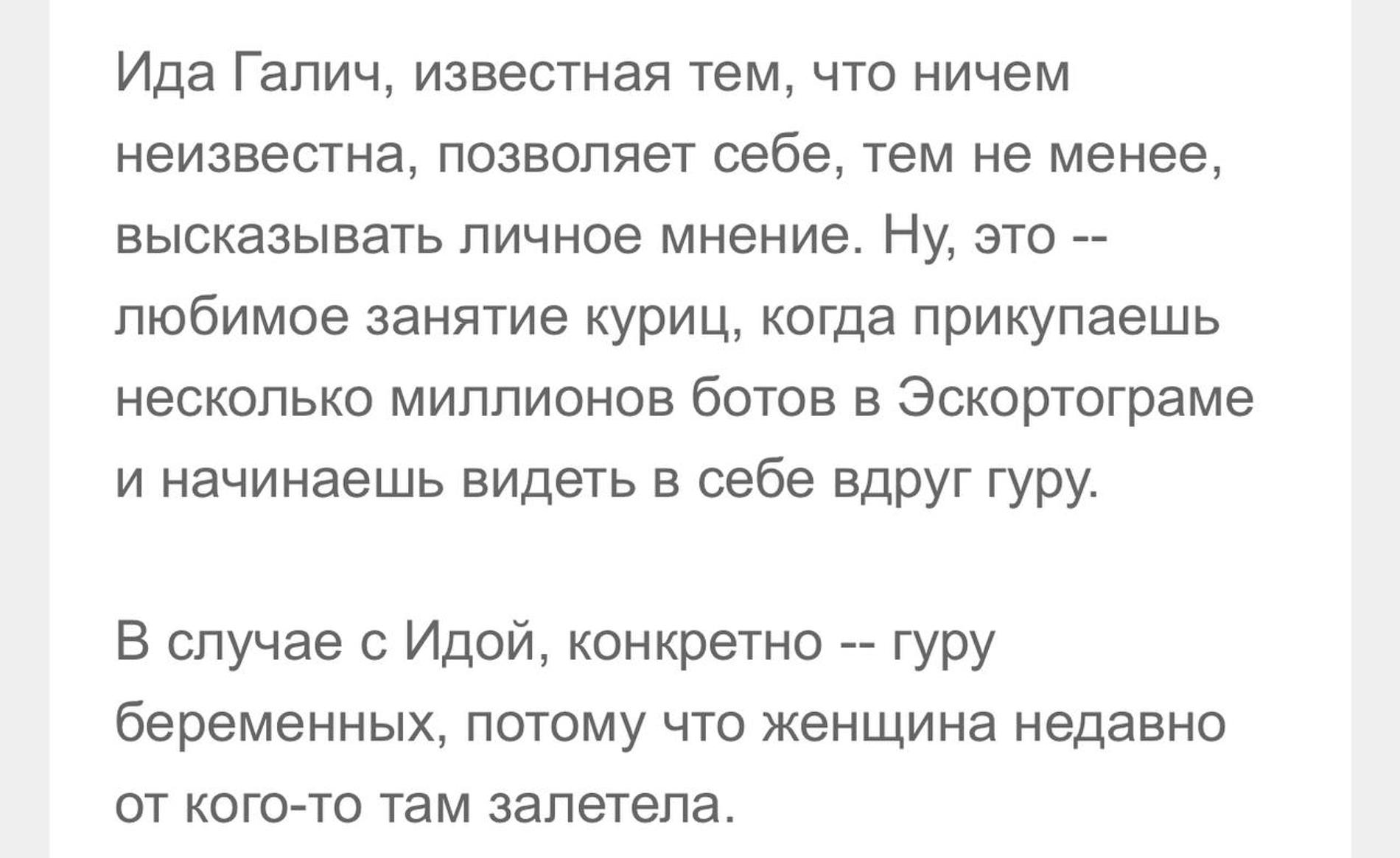 Ведущая шоу «Есть вопросики» опубликовала пример самого «безобидного» хейтерского поста о себе в блоге Лены Миро. «Лена, Лена. Самый безобидный высер от Миро. П.С. Мне искренне хочется, чтобы молодые люди жили жизнь. Так должно быть», — подытожила Ида Галич.