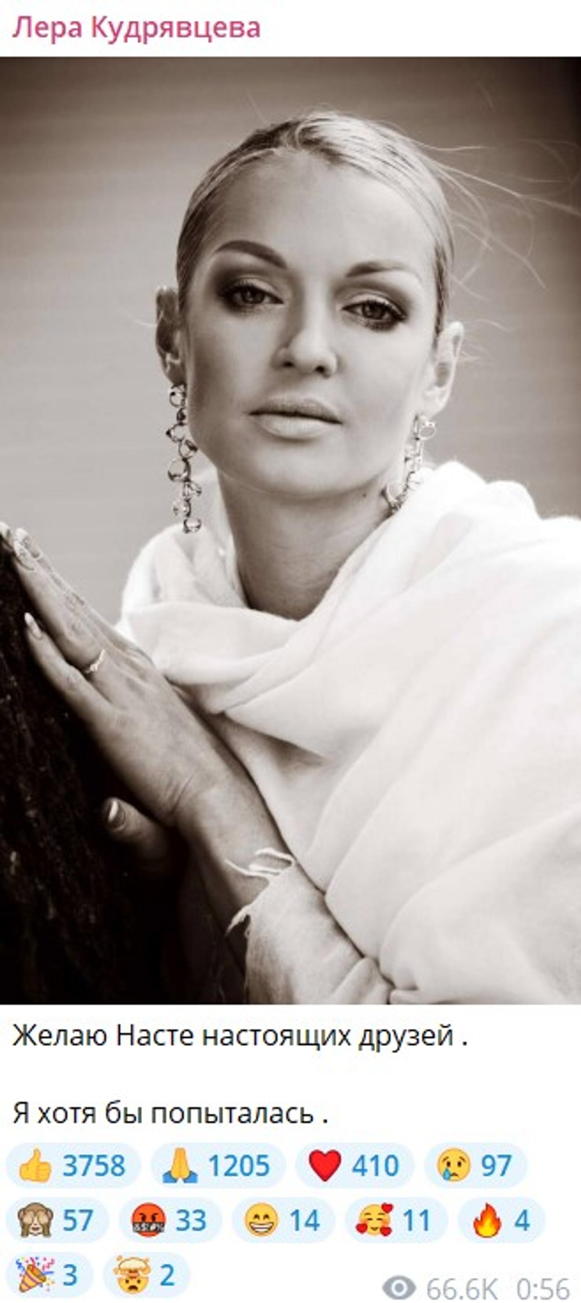 На публикацию подруги отозвалась Лера Кудрявцева. «Короче, Катя моя летела с Настей в одном самолете, в принципе, я репостнула ее. <...> Настю надо спасать, а не глумиться над ней», — призвала общественность телеведущая. Бывшая прима Большого театра остро восприняла критику в свой адрес. Анастасия не понимает, зачем обсуждать ее в Сети, если можно взять и написать или позвонить ей напрямую.