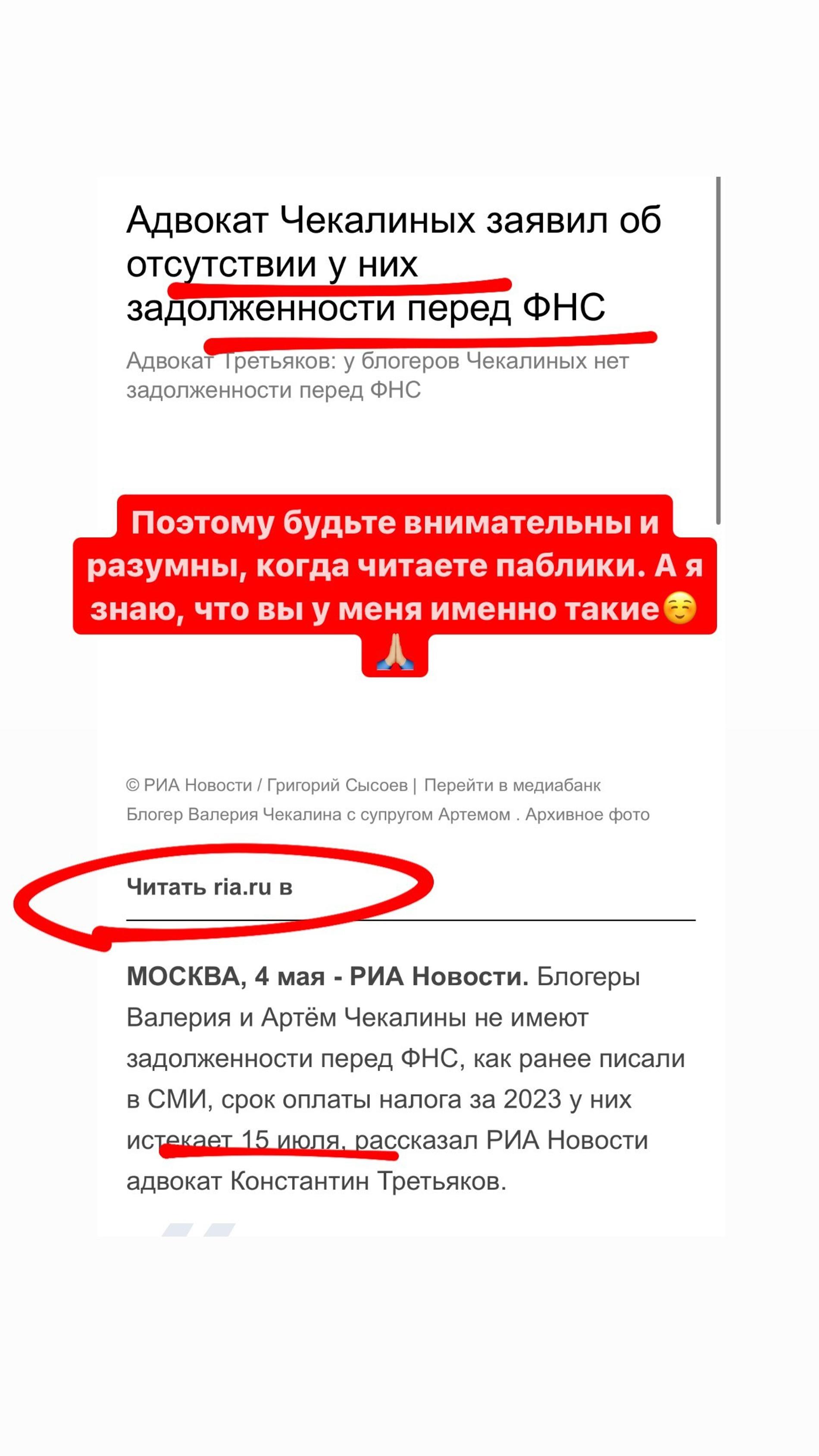 Чекалина также обратила внимание на комментарий своего адвоката Константина Третьякова. «У Чекалиных нет задолженности по налогам, срок оплаты поданной декларации истекает 15 июля, они оплатят поданную сумму вовремя», — пояснил Третьяков, с которым накануне связалось РИА «Новости».