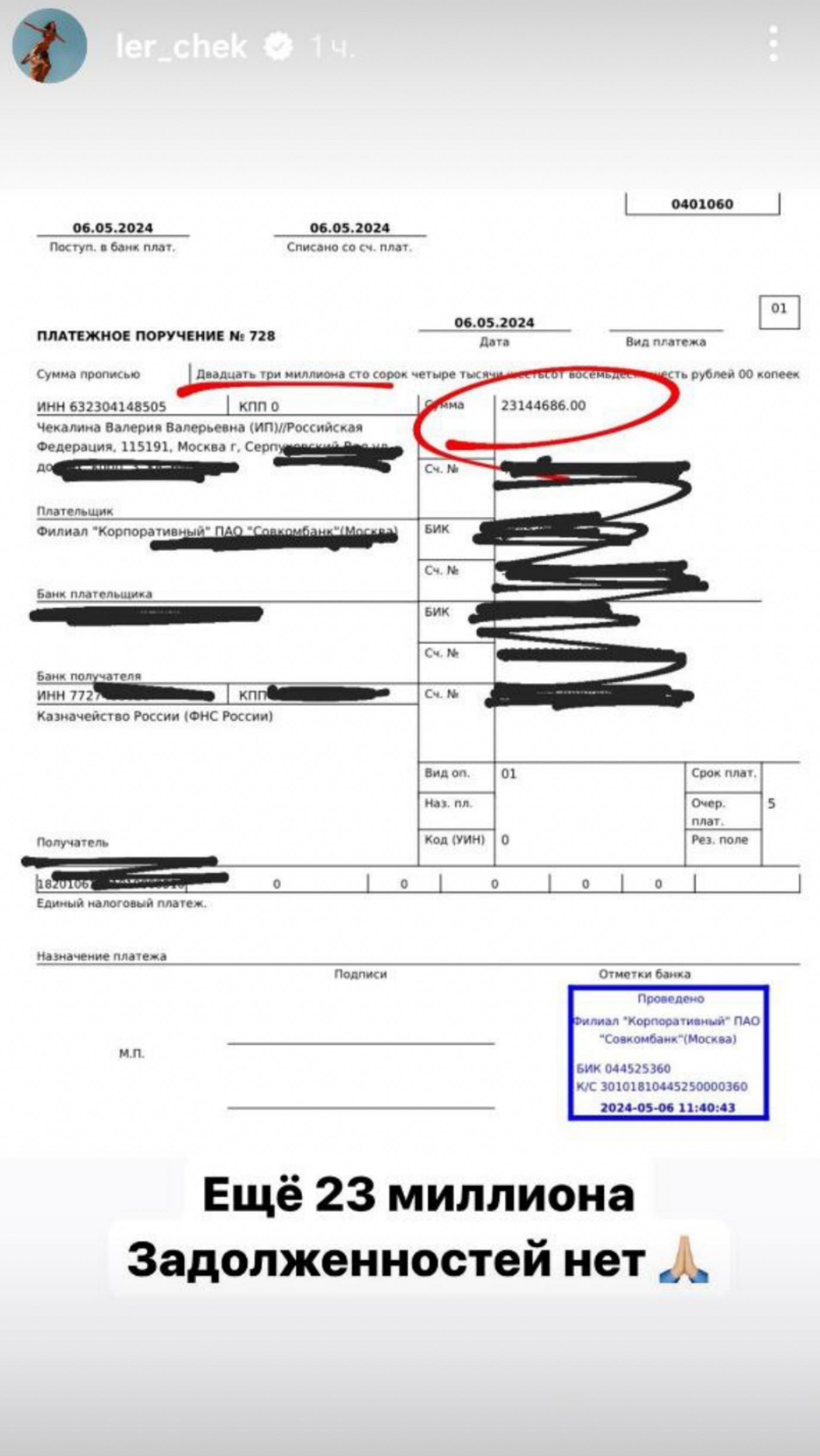 Чтобы не быть голословной, Лера опубликовала скрин платежного поручения, которое свидетельствует о том, что сегодня девушка погасила очередной долг в размере 23 миллионов рублей.