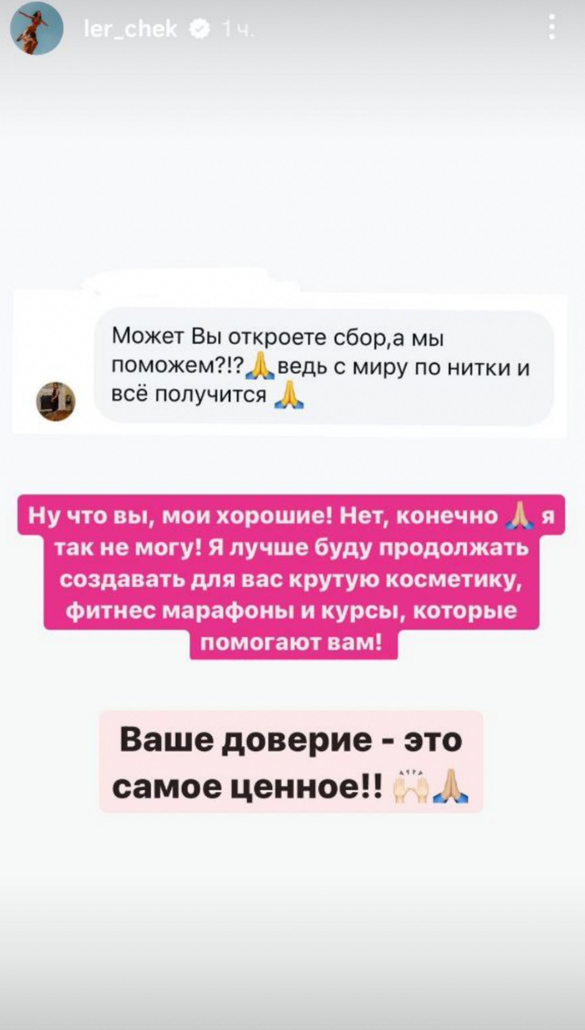 В ответ на слезное признание Лерчек сердобольные подписчики предложили ей помощь. «Может, вы откроете сбор, а мы поможем? Ведь с миру по нитке, и все получится», — написали в директ. Лера поблагодарила, но ожидаемо отказалась. «Ну что вы, мои хорошие! Нет, конечно. Я так не могу! Я лучше буду продолжать создавать для вас крутую косметику, фитнес-марафоны и курсы, которые помогают вам!» — отреагировала блогер. «Главное, что все здоровы», — подытожила Лерчек. Не поспоришь.