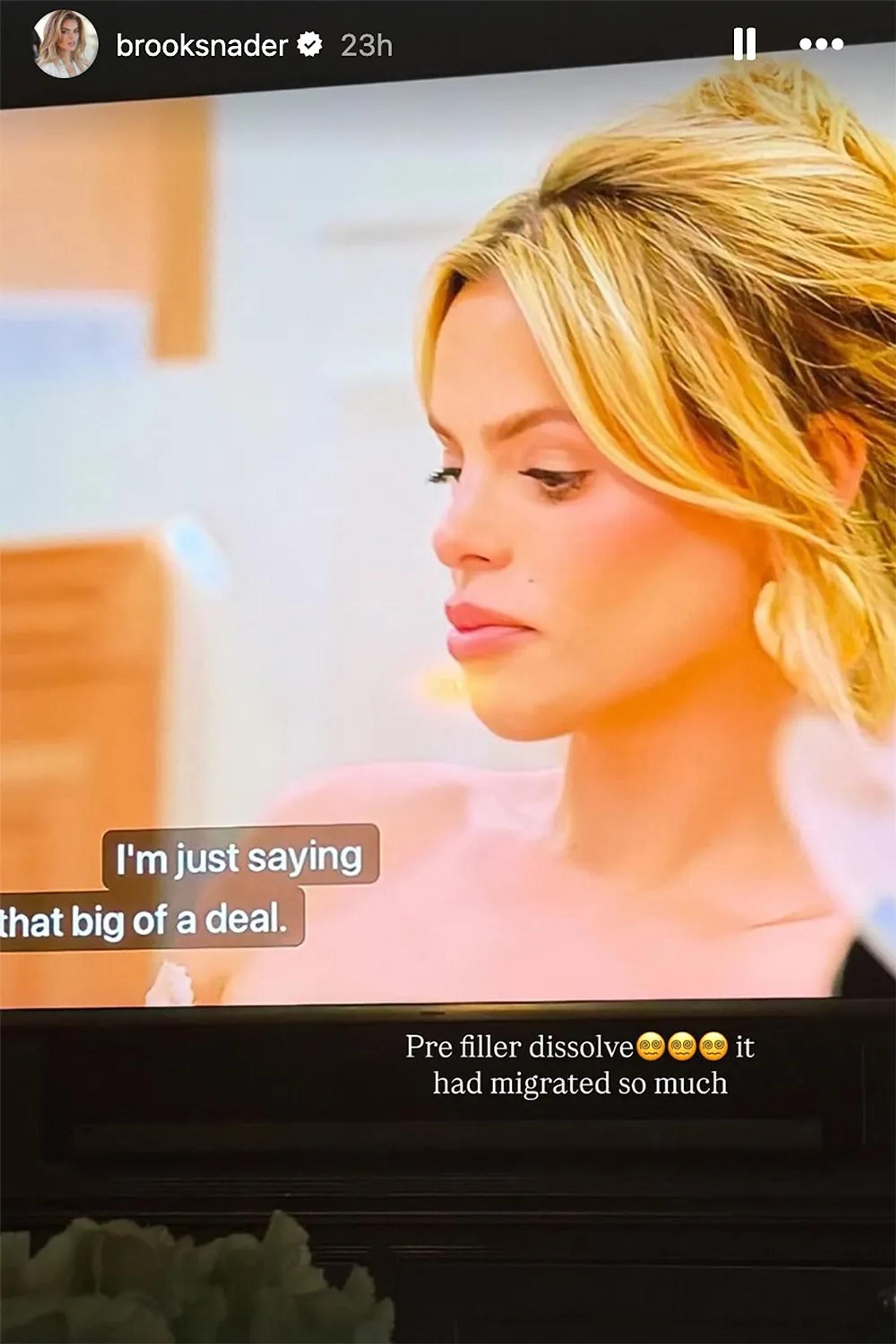 Модель также показала сравнение своего профиля до и после процедуры, отметив, что филлеры сильно мигрировали.