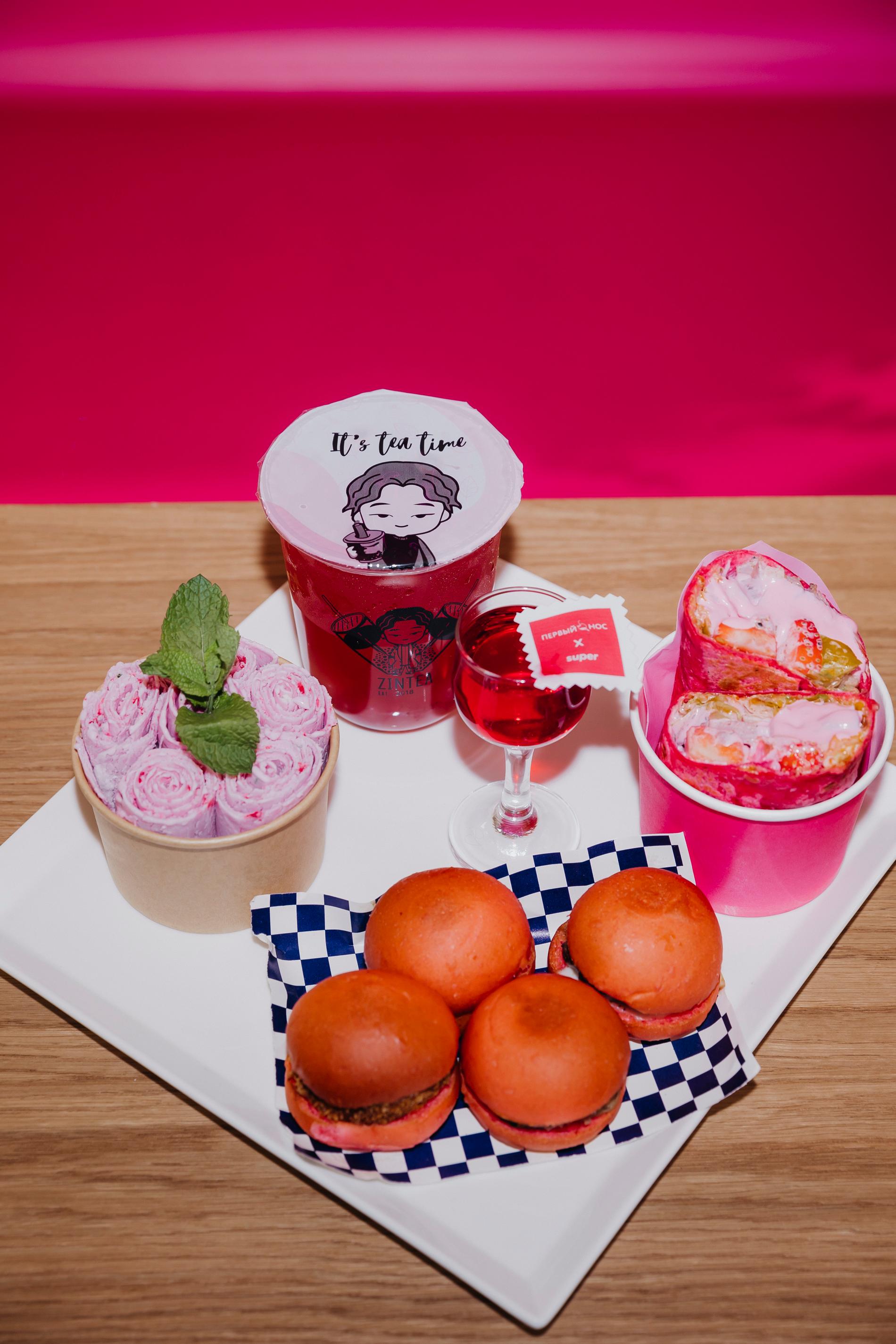 После того как все гости собрались, Super представил свое фирменное сет-меню от корнеров Центрального рынка. В него вошли бабл-ти под названием «Жизнь одна, кайфуй!», розовая шаурма «Мало половин», мини-бургеры «Если хочешь вкусить — вкуси», мороженое с малиной и мятой «Девочка, танцуй» и шот «Солнце Монако».