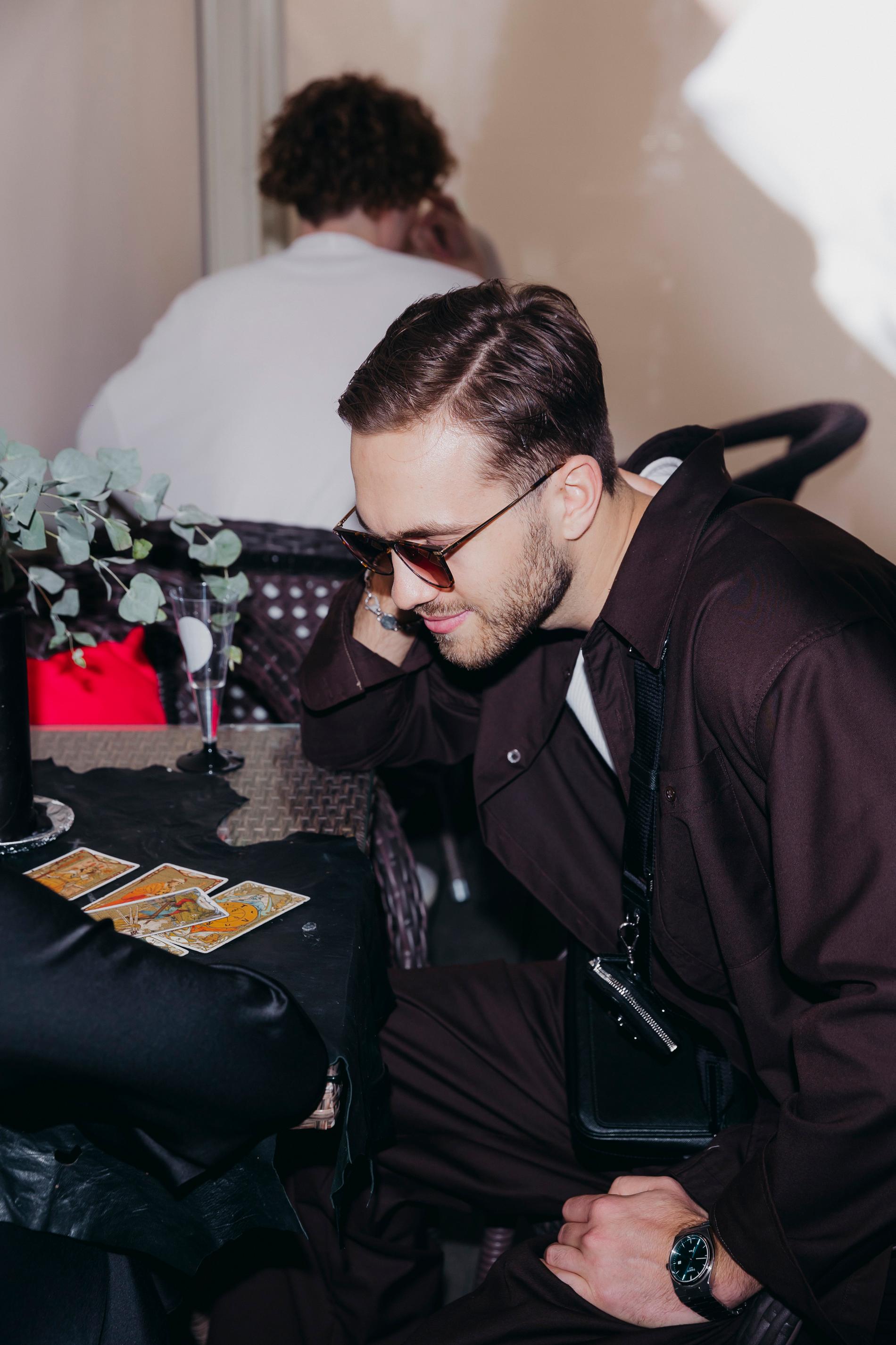 Ну а «на десерт» все желающие могли получить ответы на личные вопросы у карт таро. Александр Поверин оказался в первых рядах — видимо, хотел узнать, какое будущее его ждет с Клавой Кокой. Но мы лишь аккуратно подглядывали за процессом, так что вопрос, который волнует Александра, не услышали.