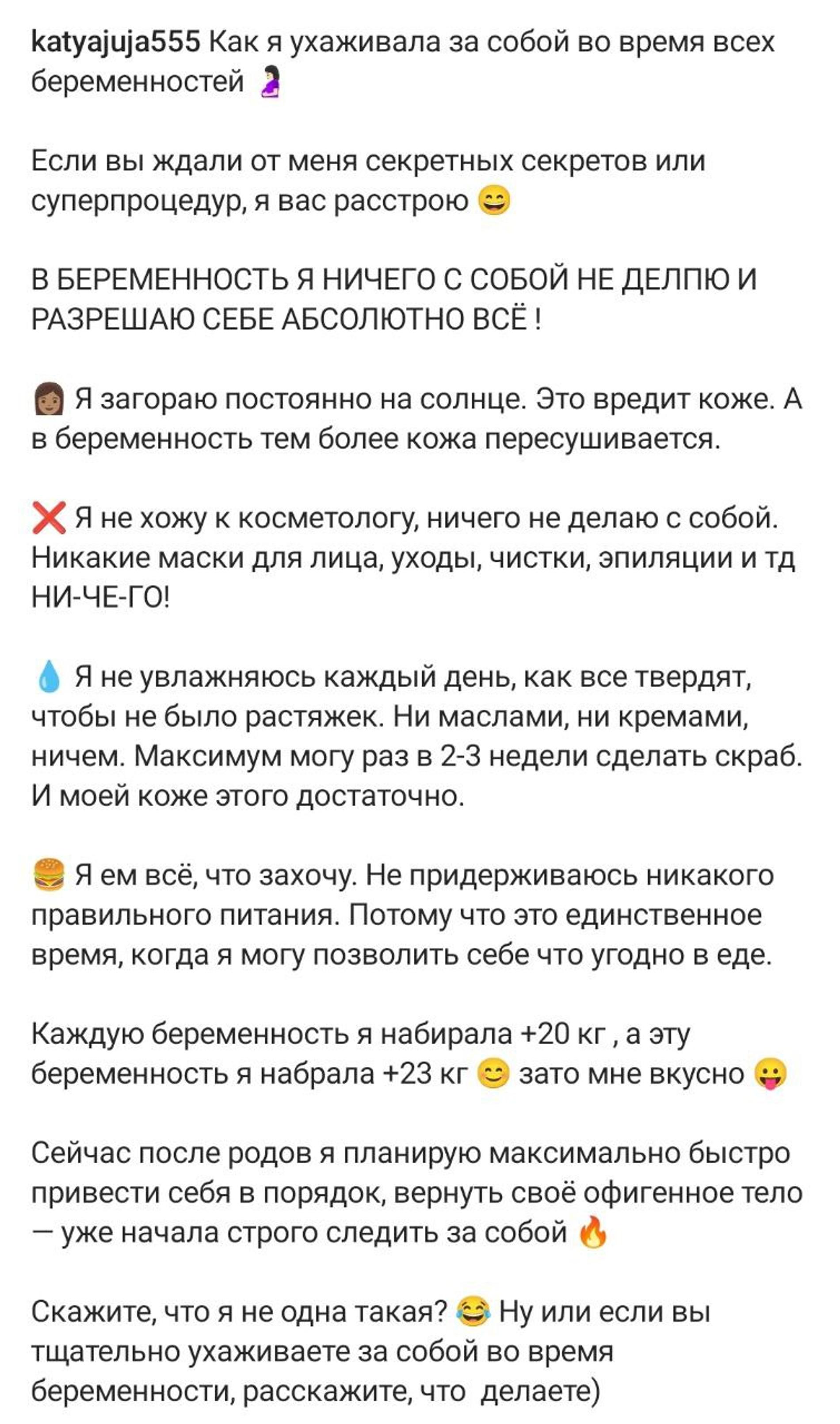 Если верить звезде «Дома-2», все 9 месяцев она не ходила к косметологу, не пользовалась кремами и маслами против растяжек и не придерживалась правильного питания — разрешала себе есть все, что захочет. Но нас больше удивил первый пункт: Катя написала, что постоянно загорала на солнце, хотя для кожи это, мягко говоря, не полезно. Что ж, надеемся, она просто пропустила частицу «не» в первой части предложения, а то какие-то совсем уж вредные советы получаются!