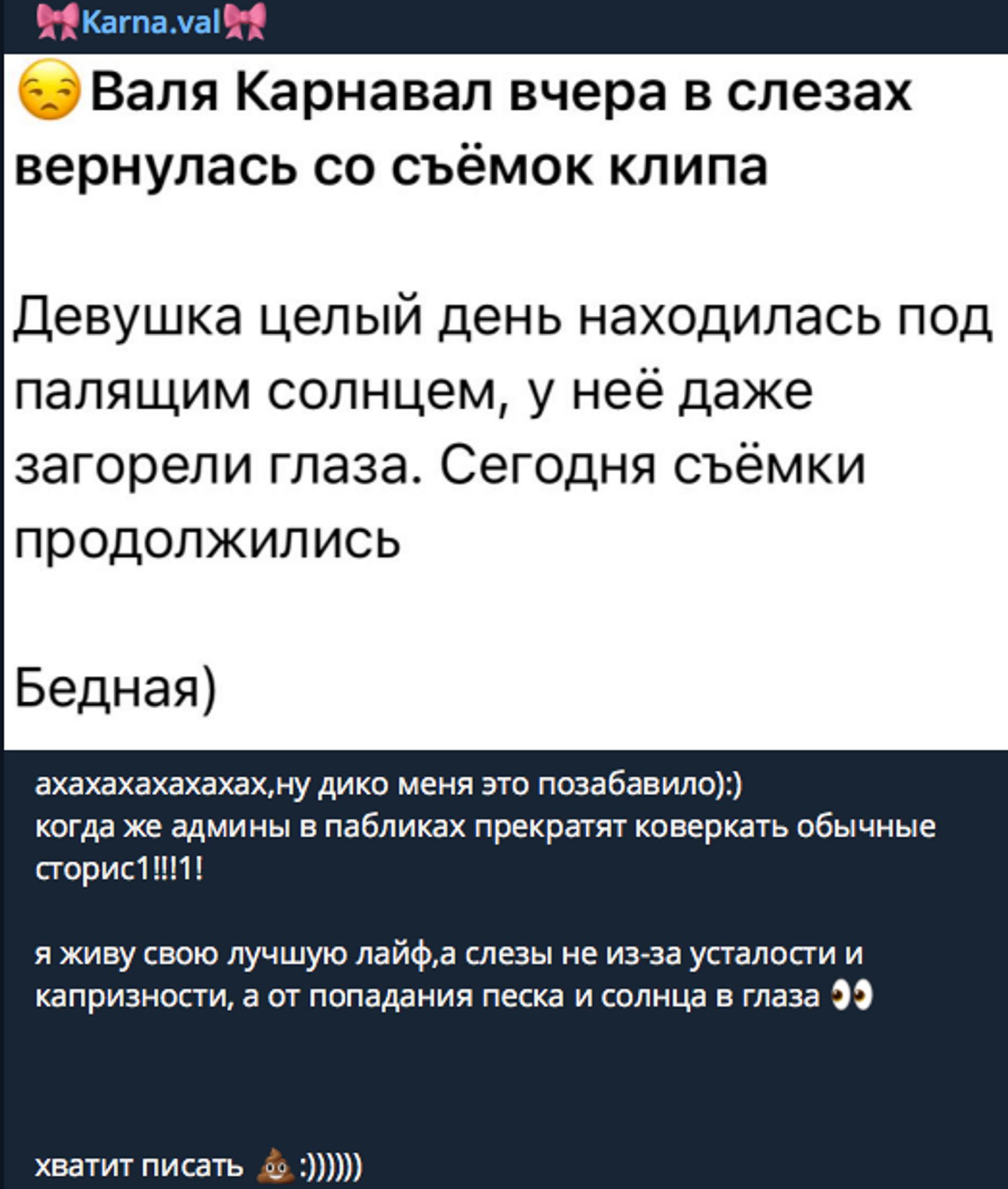 Валя Карнавал заявила, что ее неправильно понимают в соцсетях. Мол, админы пабликов вечно делают собственные выводы, которые не соответствуют действительности. Например, свежие сторис со слезами на глазах и рассказом про съемки клипа в условиях экстремальной жары некоторые восприняли как жалобы на жизнь.