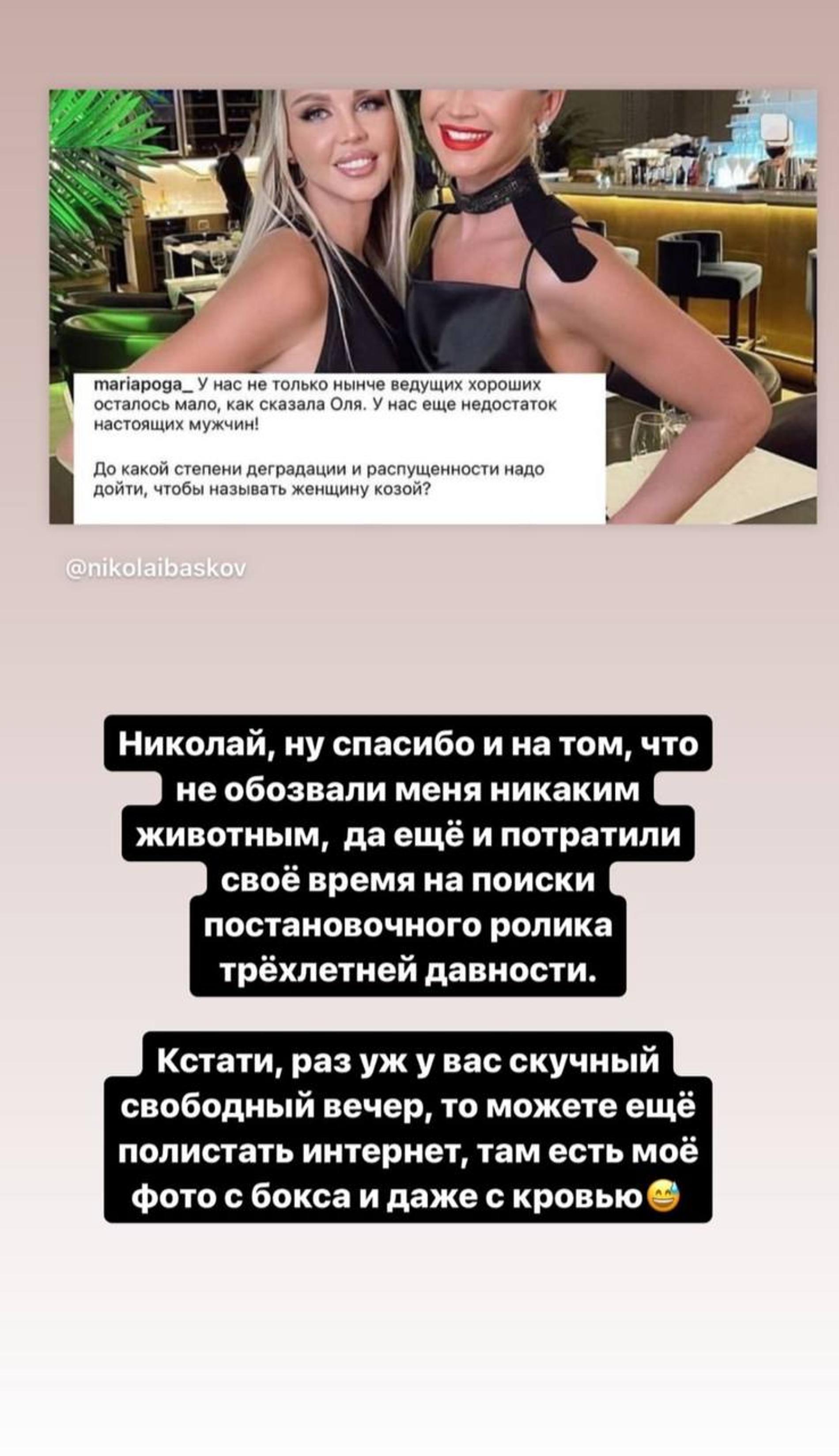 А началось все, напомним, с шутки Николая над Ольгой Бузовой на «Премии МУЗ-ТВ 2024. Возвращение». После выступления певицы он сравнил ее блестящий наряд с новогодней елкой и сказал, что впервые видит ее на сцене в закрытом наряде. Артистка молчать не стала и в ответ заявила, что хороших ведущих осталось мало. После концерта она высказалась о Николае и в соцсетях — мол, даже ведущим иногда стоит молчать. Следом слово взял Басков. «Я могу и без микрофона, в отличие от тех, кто в него, как коза, кричит», — написал он в соцсетях. Тут-то подруга Бузовой Мария Погребняк и не сдержалась.