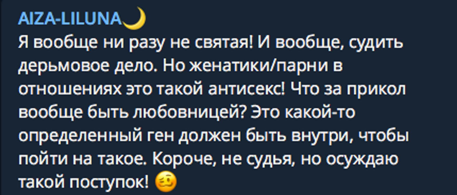 Айза опубликовала в личном блоге скрины поста и спросила своих подписчиков, что они обо всем этом думают. Следом бизнесвумен озвучила и собственное мнение об отношениях с женатыми мужчинами. «Я вообще ни разу не святая! И вообще судить — дерьмовое дело. Но женатики в отношениях — это такой антисекс! Что за прикол вообще быть любовницей? Это какой-то определенный ген должен быть внутри, чтобы пойти на такое. Короче, не судья, но осуждаю такой поступок!» — не называя имен, написала Лилуна.