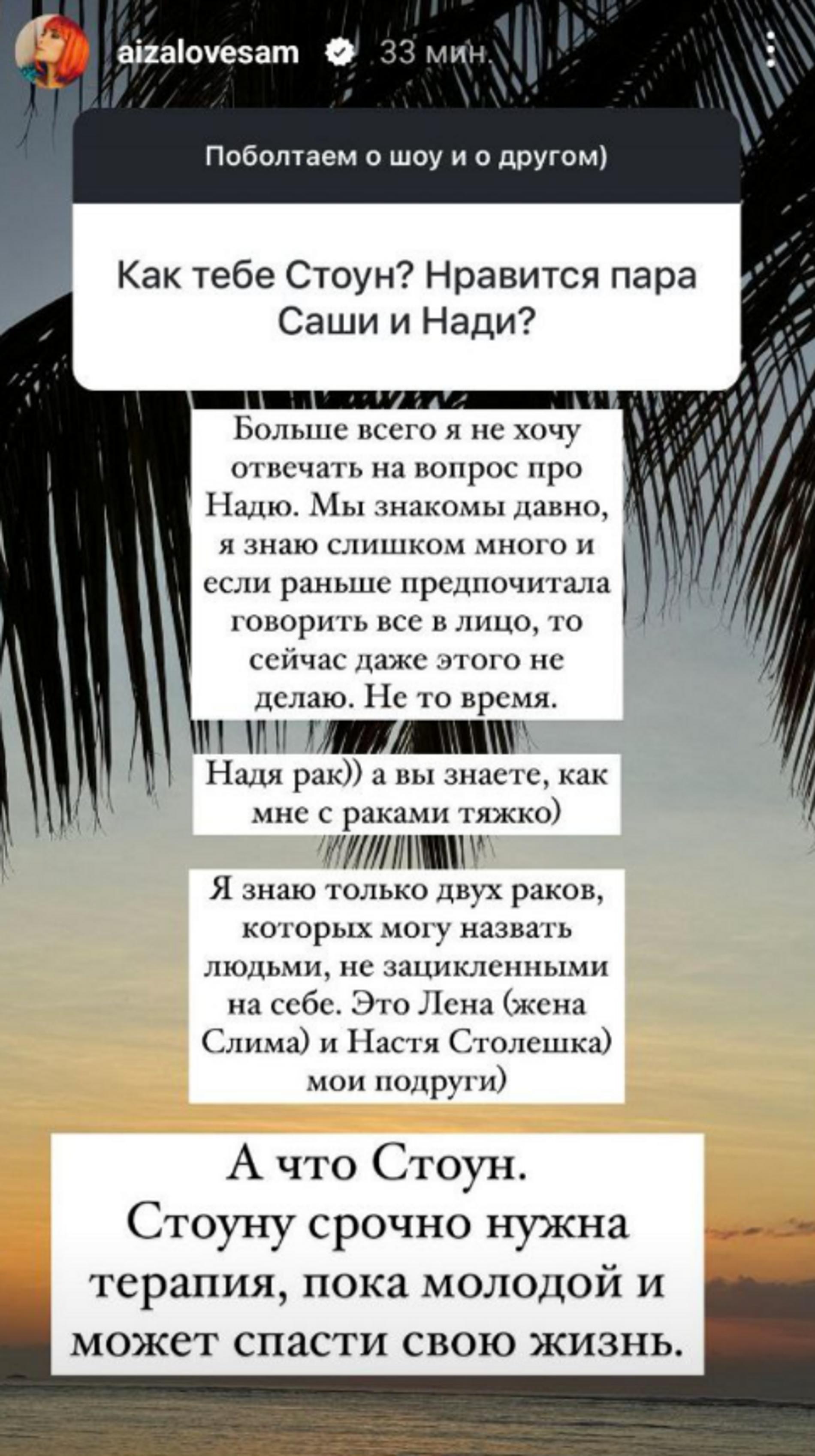 Айза-Лилуна Ай объяснила шокирующее поведение Саши Стоуна и Нади Сысоевой в телешоу: «Я знаю слишком много»
