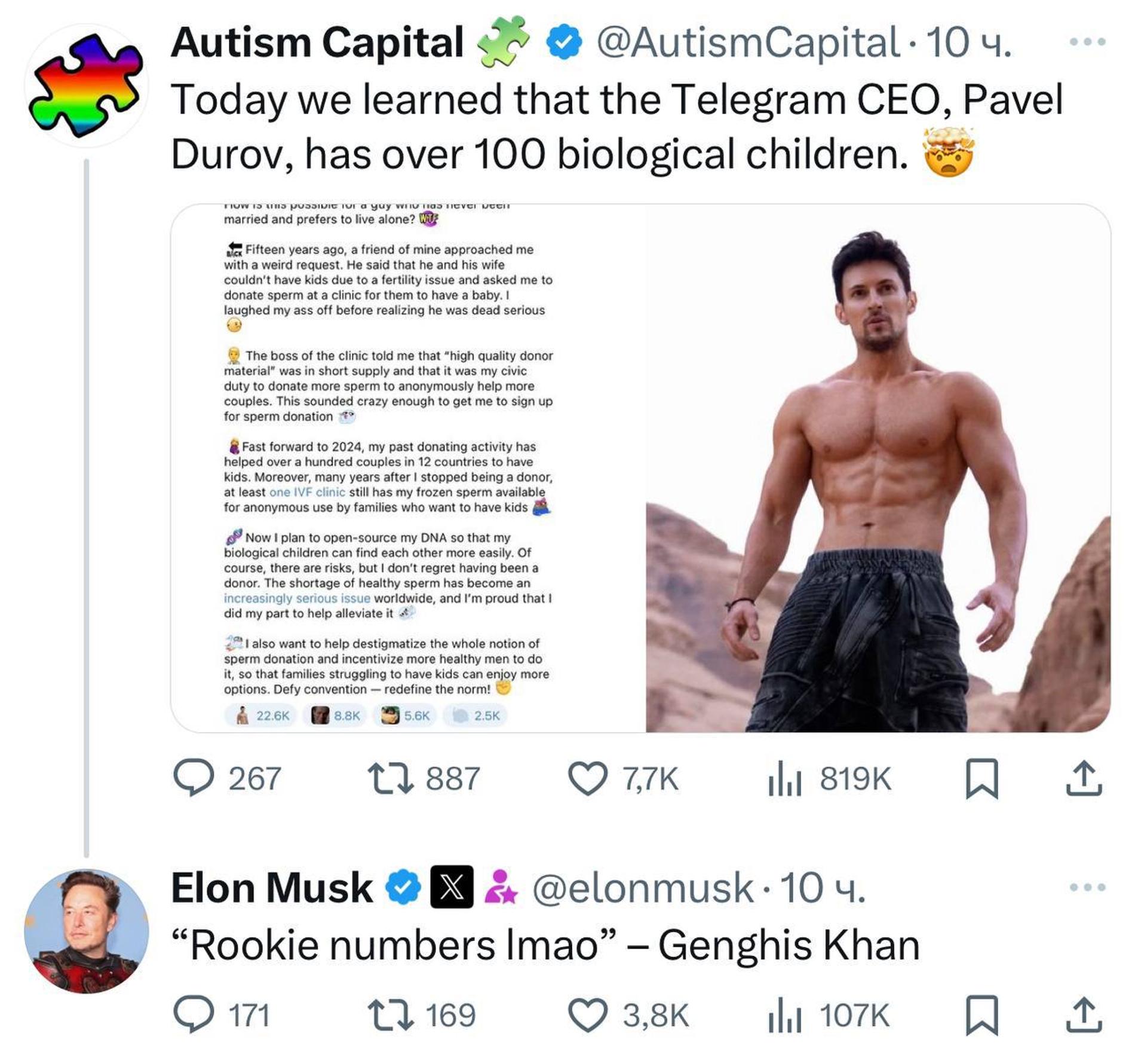 Шок-новость о том, что у Павла Дурова на самом деле более сотни биологических детей по всему миру, не прошла мимо еще одного знаменитого и богатого многодетного отца — Илона Маска. В соцсети X (бывший Twitter) Маск пошутил, мол, основатель Telegram, конечно, неплох, но, по мнению Чингисхана, явно был бы на уровне «новичок» (по разной информации, у хана Монгольской империи было от нескольких сотен до нескольких тысяч детей).