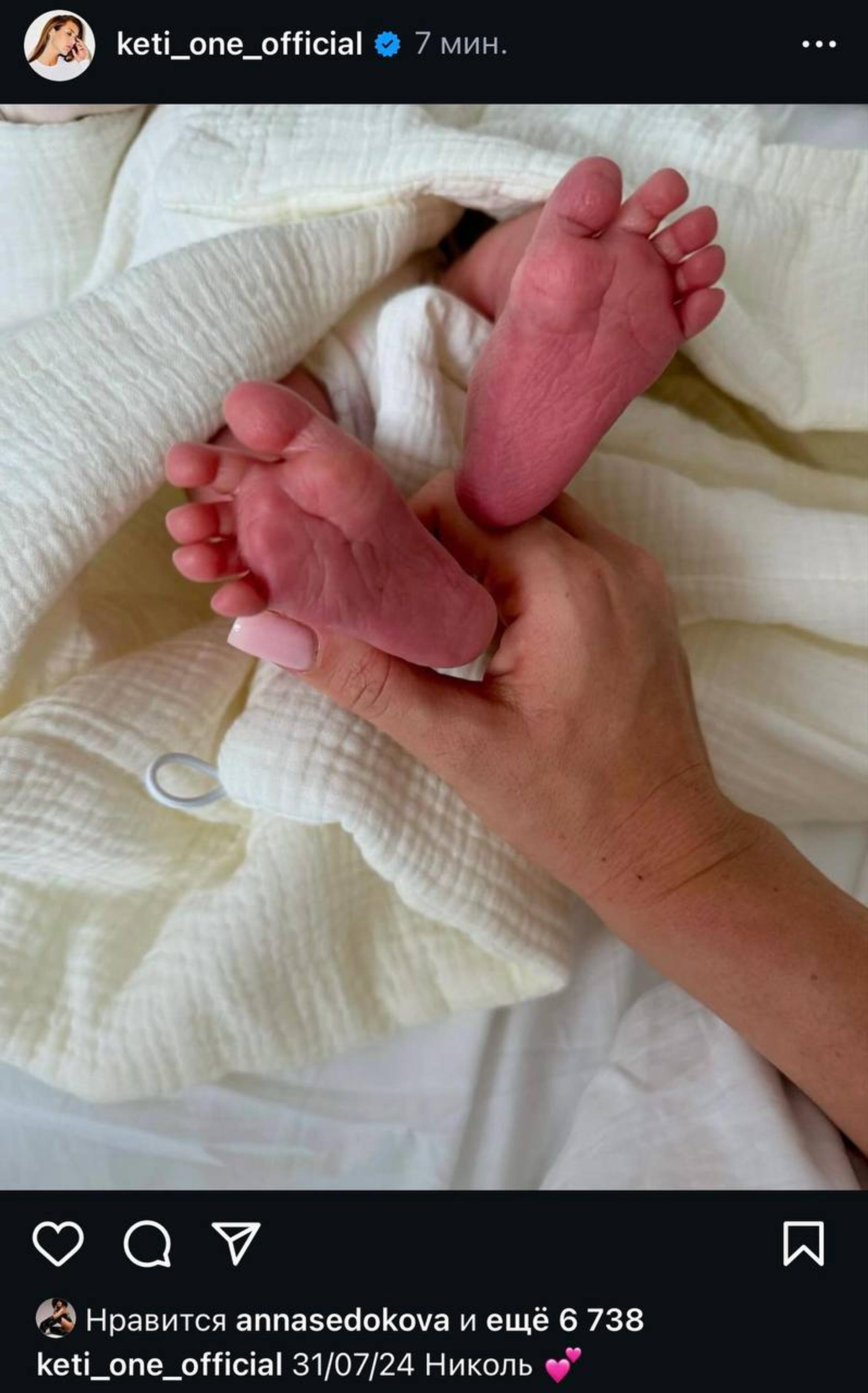 Нежданно-негаданно Кети Топурия осчастливила поклонников радостной новостью: солистка группы «А'Студио» стала мамой в третий раз. Об этом певица сообщила в запрещенной соцсети, опубликовав первое фото новорожденной дочери.