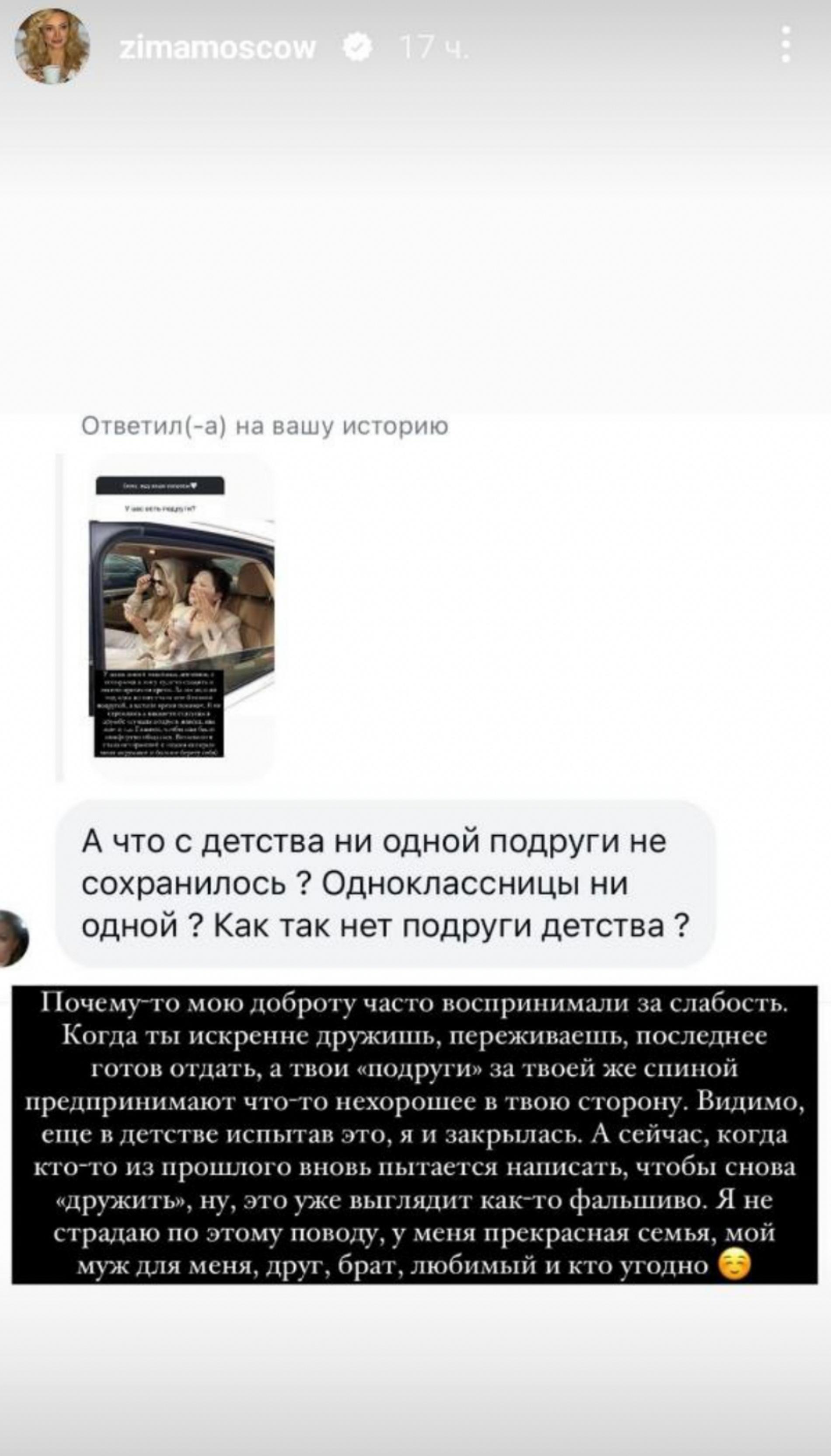 «Почему-то мою доброту часто принимали за слабость... Когда ты искренне дружишь, переживаешь, последнее готов отдать, а твои подруги за твоей же спиной предпринимают что-то нехорошее в твою сторону... Видимо, испытав это в детстве, я закрылась. А сейчас, когда кто-то из прошлого пытается снова подружиться, ну это уже выглядит как-то фальшиво», — разоткровенничалась девушка.