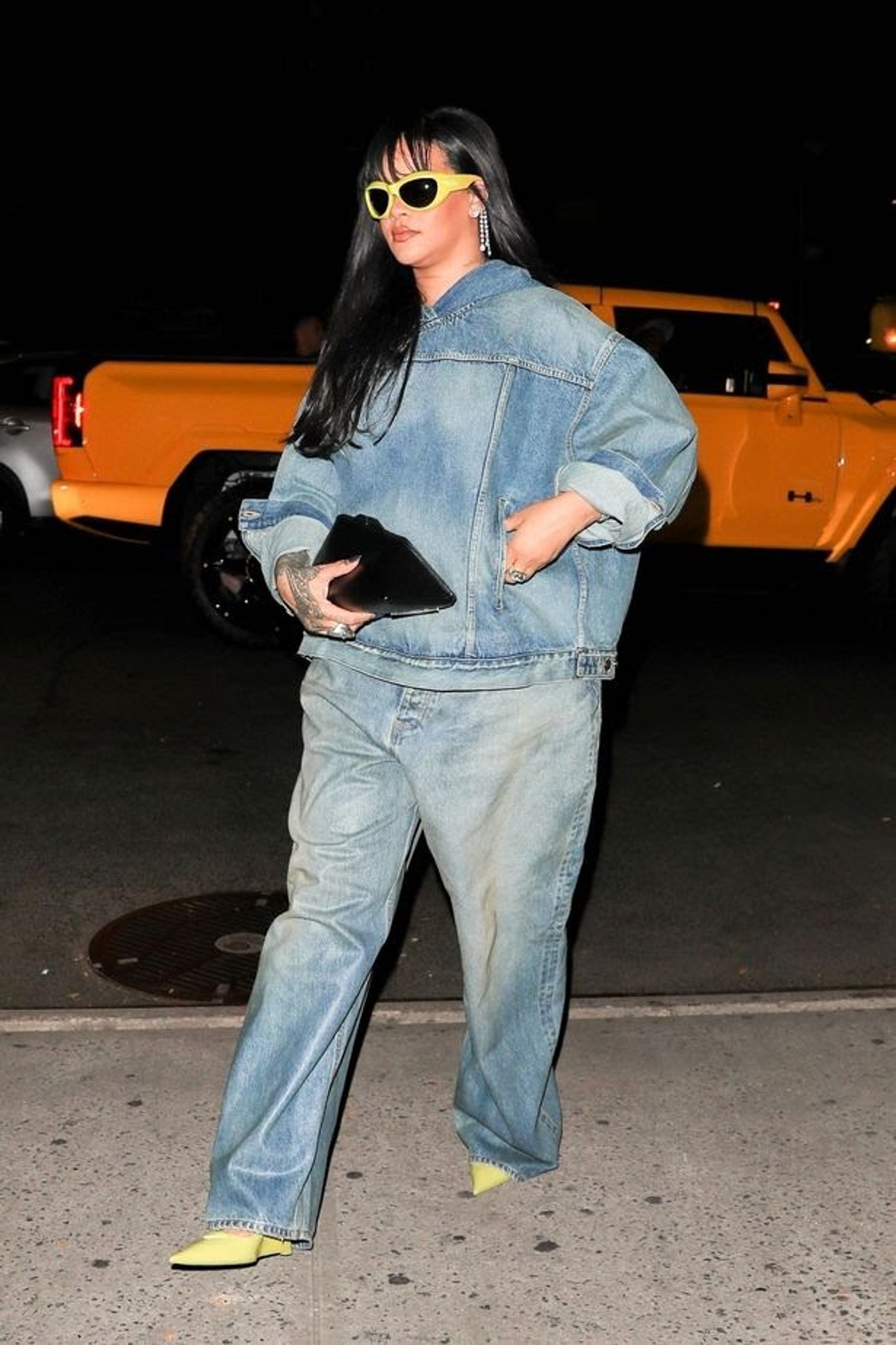 Как и у любой новоиспеченной мамы, у Рианны не так уж много свободного времени — неудивительно, что все последние стритстайл-фото звезды сделаны именно ночью, когда малыш спит. Вот и на этот раз она забежала в джинсовом оверсайз-костюме Balenciaga к подружке на вечеринку с пиццей в два часа ночи, а уже в шесть утра поехала обратно домой. Подозреваем, что сработала радионяня!
