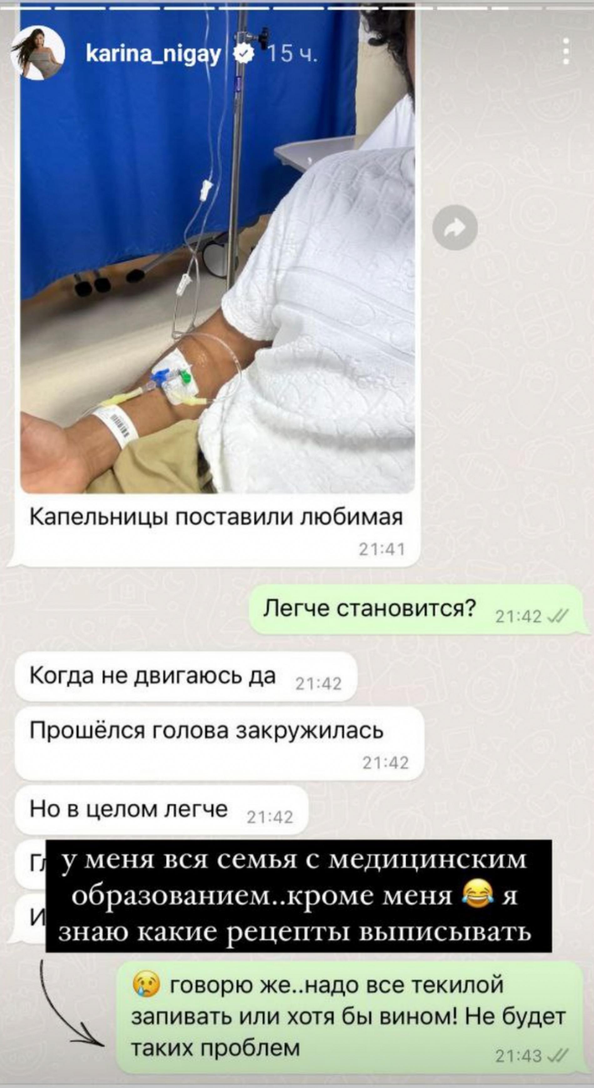 Карина не оставила любимого в трудную минуту и отправилась в госпиталь в месте с ним. «Меня, похоже, в соседнюю палату положат», — с грустным лицом сообщила девушка из машины скорой помощи и дала понять что боится больниц. Блогер не сообщила, что именно случилось с ее бойфрендом, но, судя по скриншоту переписки Карины с Ильей, речь может идти о пищевом отравлении. «Говорю же, надо все текилой запивать или хотя бы вином! Не будет таких проблем», — писала девушка возлюбленному в мессенджере. Молодой человек же сообщил, что ему поставили капельницу, после которой самочувствие вроде как улучшилось, но головокружение при ходьбе еще присутствовало.