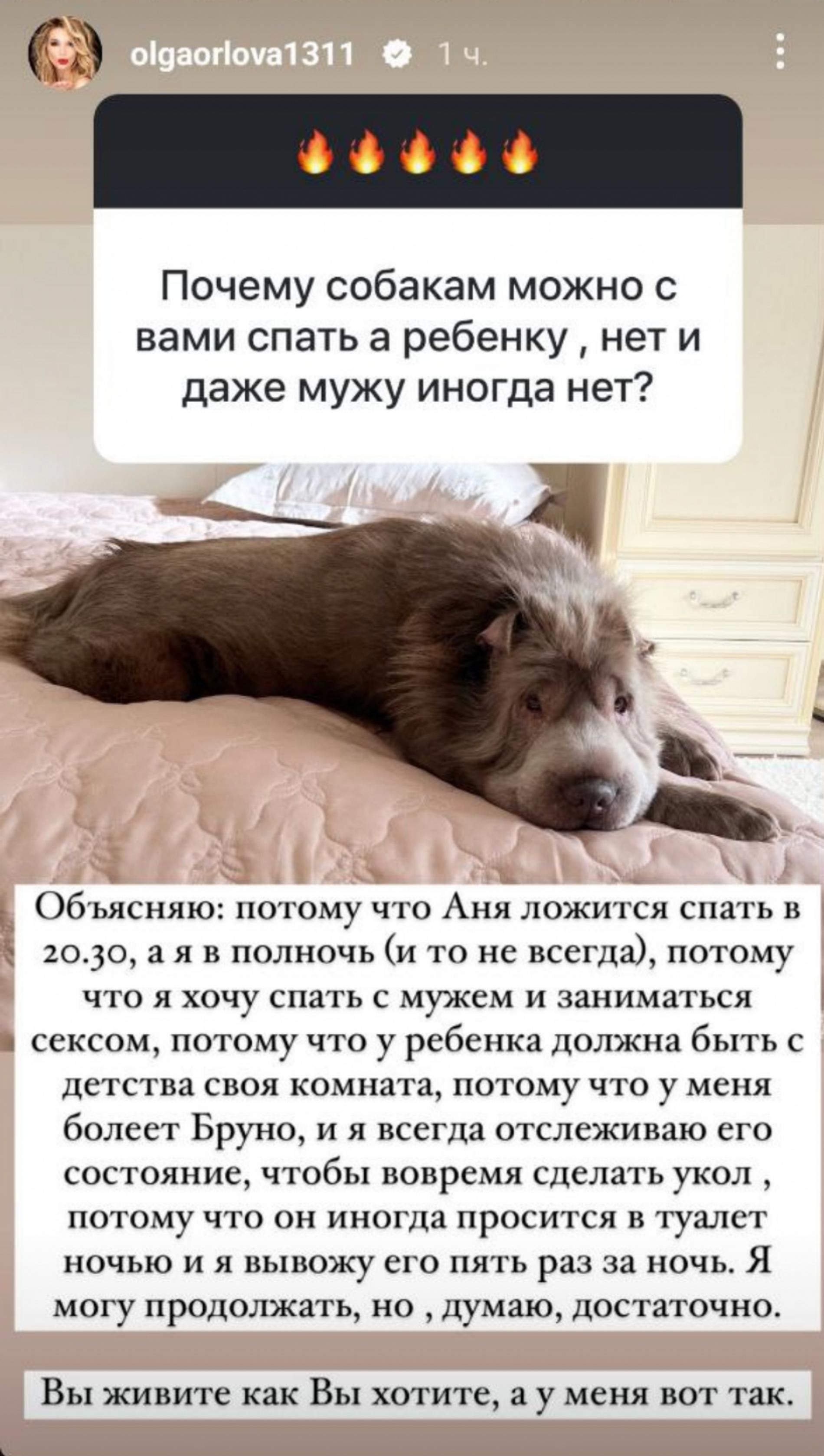 «Объясняю. Потому что Аня ложится спать в 20:30, а я в полночь (и то не всегда), потому что я хочу спать с мужем и заниматься сексом, потому что у ребенка должна быть с детства своя комната, потому что у меня болеет Бруно, и я всегда отслеживаю его состояние, чтобы вовремя сделать укол, потому что он иногда просится в туалет ночью, и я вывожу его пять раз за ночь. Я могу продолжать, но, думаю, достаточно. Вы живите как хотите, а у меня вот так», — с чувством, толком и расстановкой рассказала Ольга Орлова.