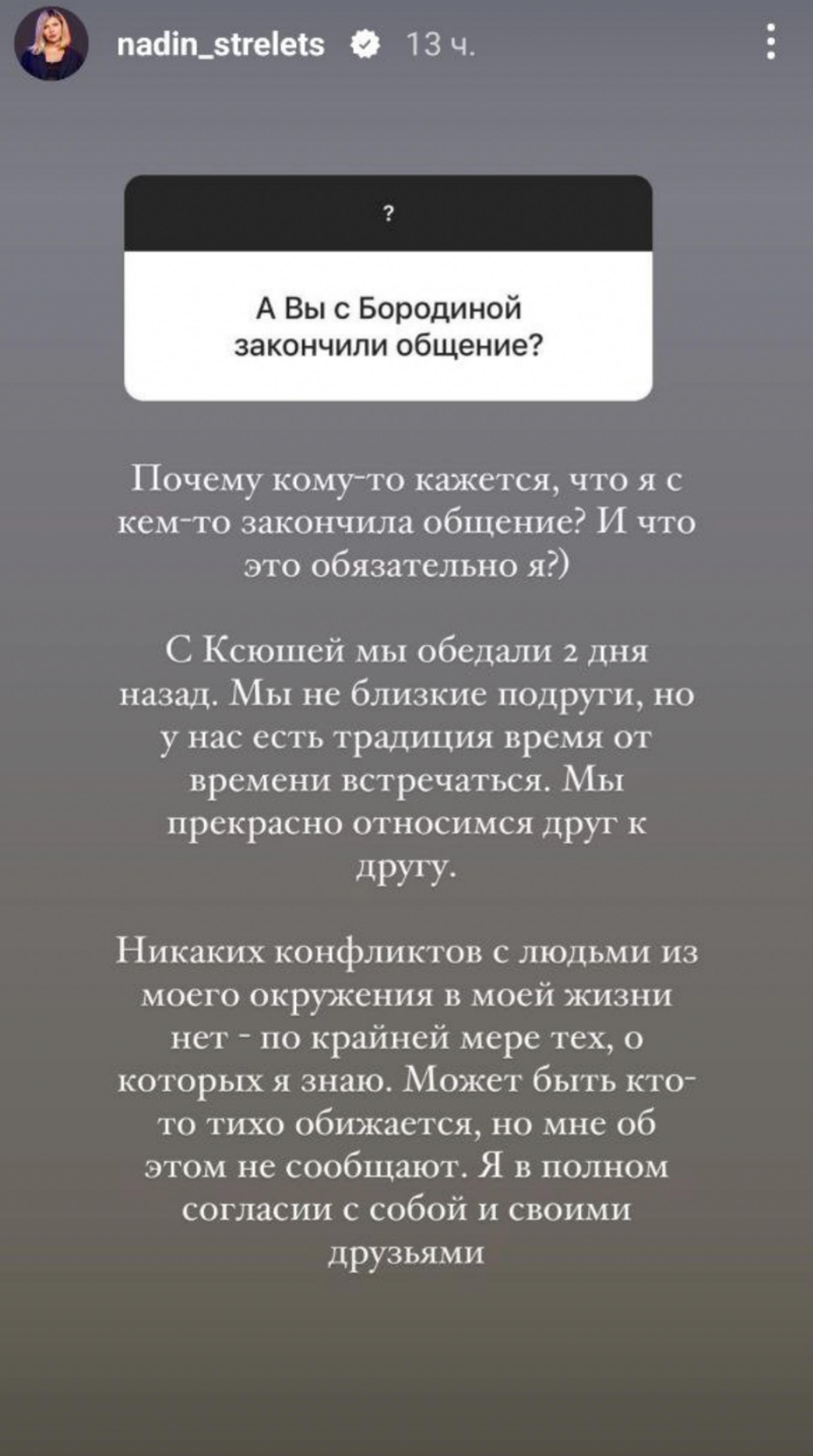 Не так давно Надежда Стрелец взяла интервью у Ксении Бородиной. Знакомством и беседой обе девушки тогда остались очень довольны и даже подружились. В соцсетях Надежды и Ксении замелькали совместные снимки и приятные отзывы друг о друге. Через какое-то время фотографий стало меньше, а потом они и вовсе перестали появляться. Подписчицы Надежды заподозрили недоброе. «А вы с Бородиной закончили общение?» — спросили на днях у Стрелец в Инстаграме*.