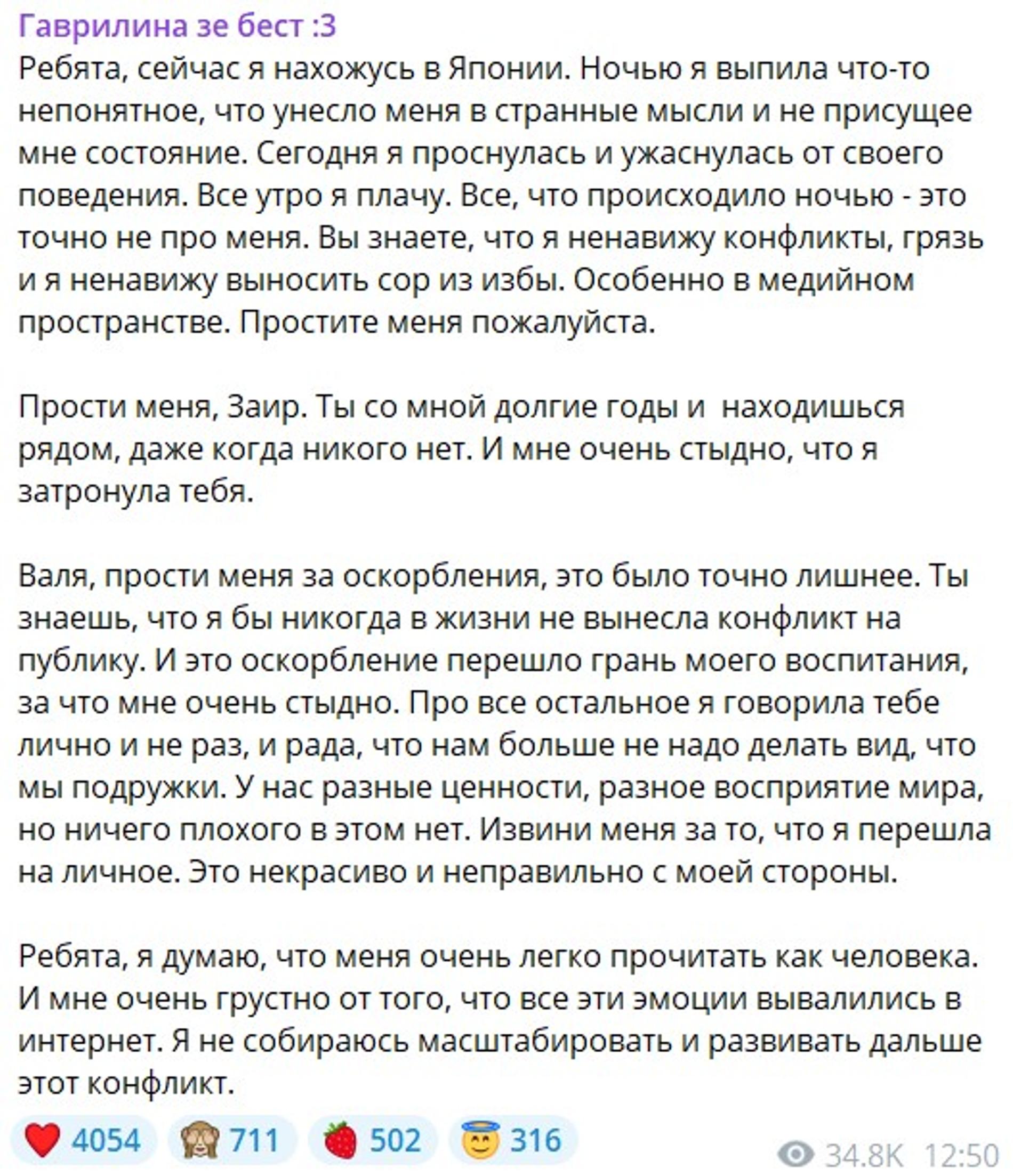 «У нас разные ценности, разное восприятие мира, но ничего плохого в этом нет. Извини меня за то, что я перешла на личное. Это некрасиво и неправильно с моей стороны. <...> Мне очень грустно от того, что все эти эмоции вывалились в интернет. Я не собираюсь масштабировать и развивать дальше этот конфликт», — заключила Гаврилина.