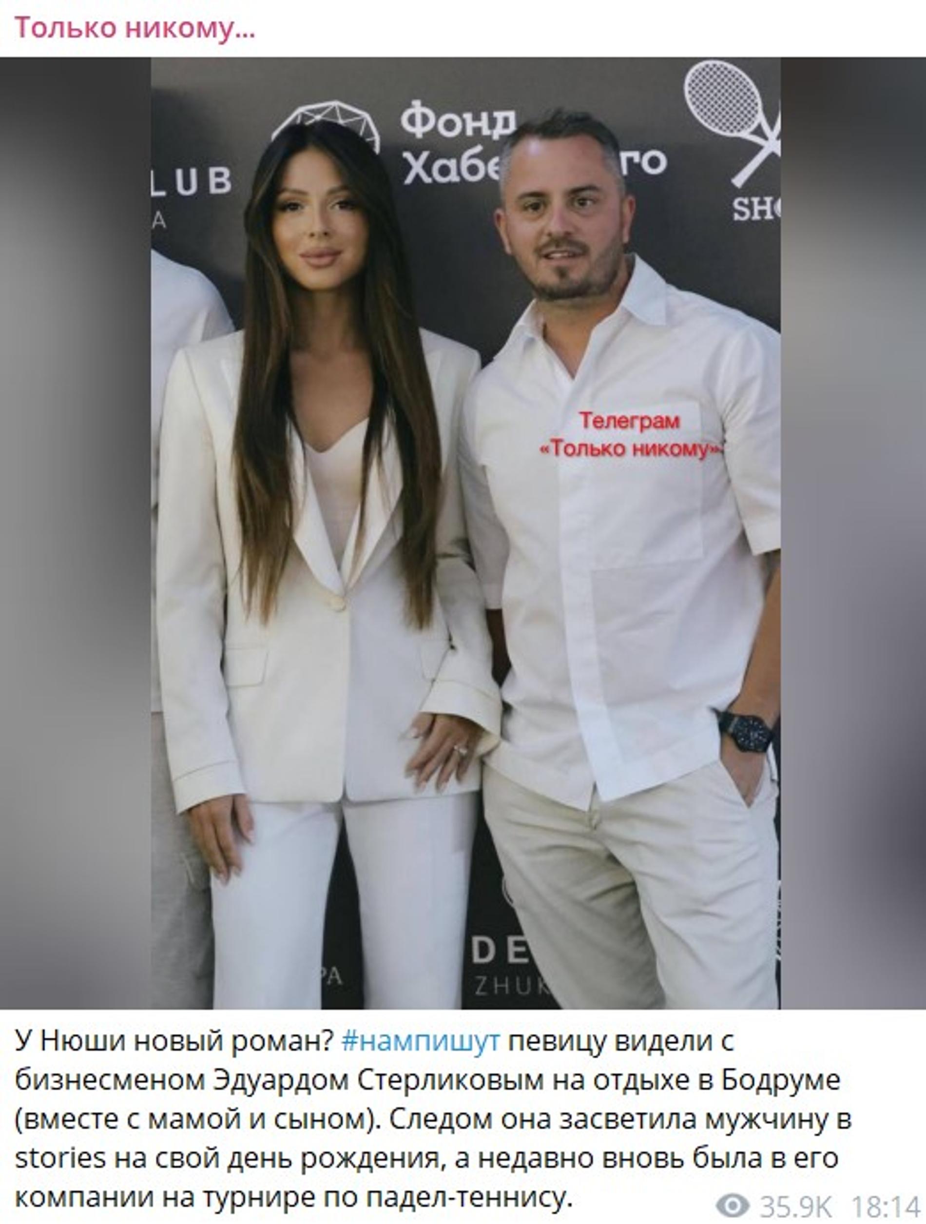 «У Нюши новый роман? #нампишут певицу видели с бизнесменом Эдуардом Стерликовым на отдыхе в Бодруме (вместе с мамой и сыном). Следом она засветила мужчину в сторис на свой день рождения, а недавно вновь была в его компании на турнире по падел-теннису», — говорится в публикации.