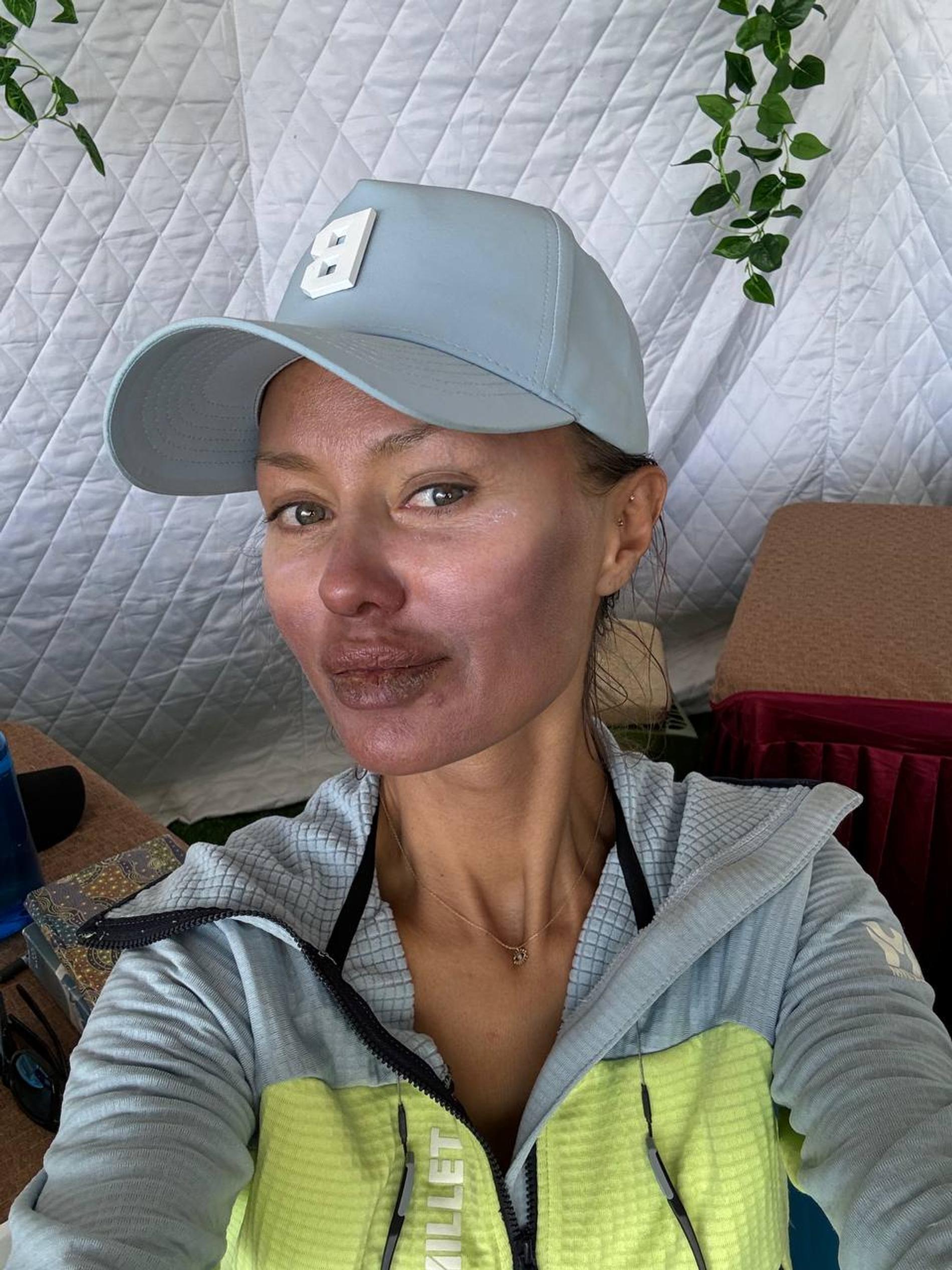 «Коротко о том, как я сходила на ротацию. Ротация — это акклиматизация в горах, когда ты идешь с базового на 1-й/2-й/3-й лагерь и спишь там в палатках на каждой высоте по две ночи, а потом возвращаешься в базовый лагерь. Обычно после ротации ты готов к восхождению! Обгорела ужасно. Герпес покрыл все губы. Но я не унываю».