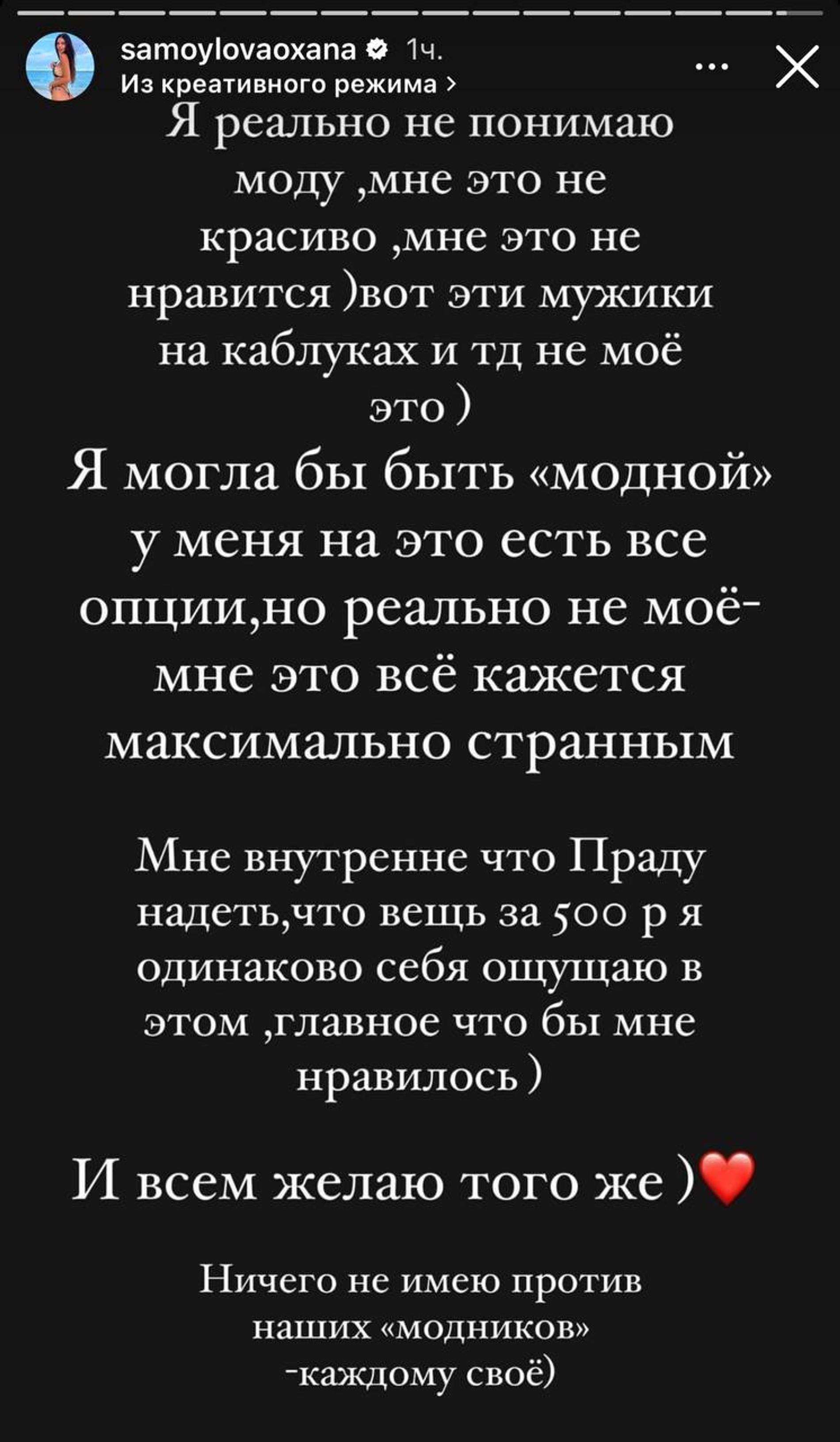 Самойлова не растерялась и прежде чем начать день с чашечки кофе, дала отпор Рогову в личном блоге. «Я реально не понимаю моду, мне это некрасиво, мне это не нравится. Вот эти мужики на каблуках и так далее — не мое это. Я могла бы быть "модной", у меня на это есть все опции, но реально не мое — мне это все кажется максимально странным. Мне внутренне что Prada надеть, что вещь за 500 рублей — я одинаково себя ощущаю в этом, главное, чтобы мне нравилось», — призналась Оксана.