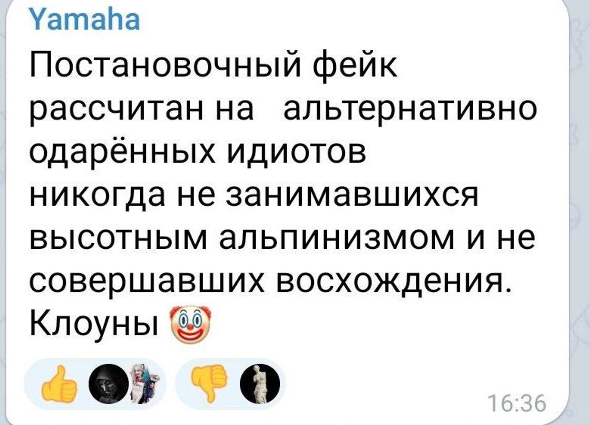 «Для Бони это просто невозможно, говорю как альпинист», «Постановочный фейк рассчитан на идиотов, никогда не занимавшихся высотным альпинизмом и не совершавших восхождения. Клоуны», — пишут в комментариях к видео Бони из похода.