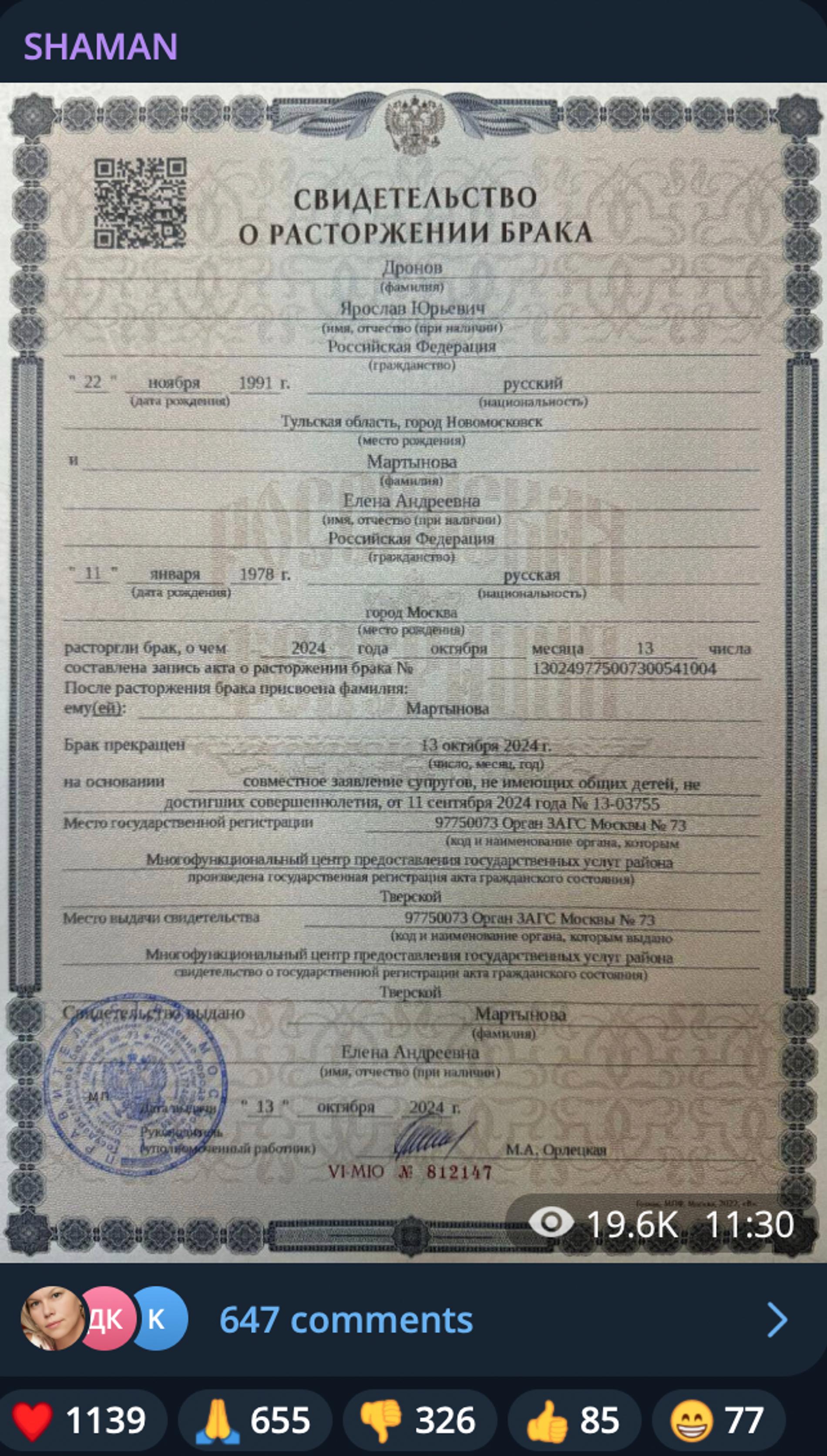 Сегодня Ярослав Дронов (настоящее имя звезды) предоставил железобетонные доказательства, что он вновь свободный мужчина. SHAMAN без лишних слов опубликовал в своем Telegram-канале скрин свидетельства о расторжении брака с Еленой Мартыновой. Согласно документу, развели пару вчера, 13 октября.