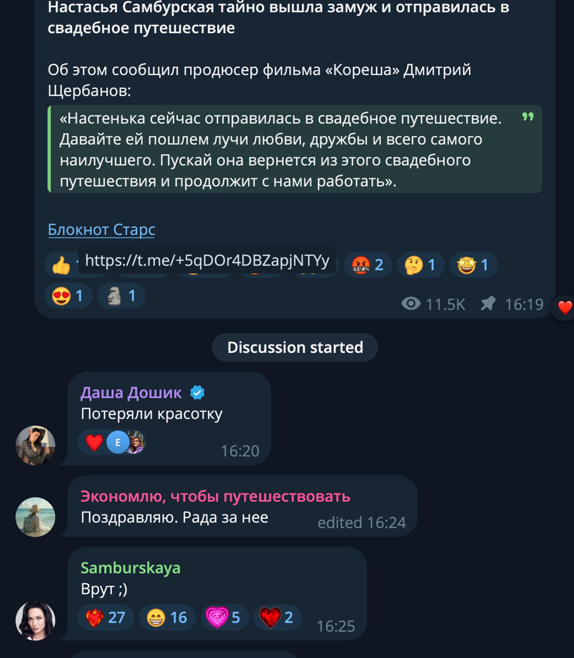После этого Настасья включилась в дискуссию, которую устроили подписчики канала, и начала отвечать на каждый второй комментарий. «Как вышла, так и зайдет. Надолго ли...» — написала читательница. «А вы почему так злорадствуете? Я у вас мужика увела, что ли?» — возмутилась Самбурская. «Ну у вас был же брак на 3 месяца. Мужчин в ухажерах тоже было немало, и это только то, что говорит Яндекс. Вам свойственно непостоянство», — продолжила перепалку со звездой подписчица.