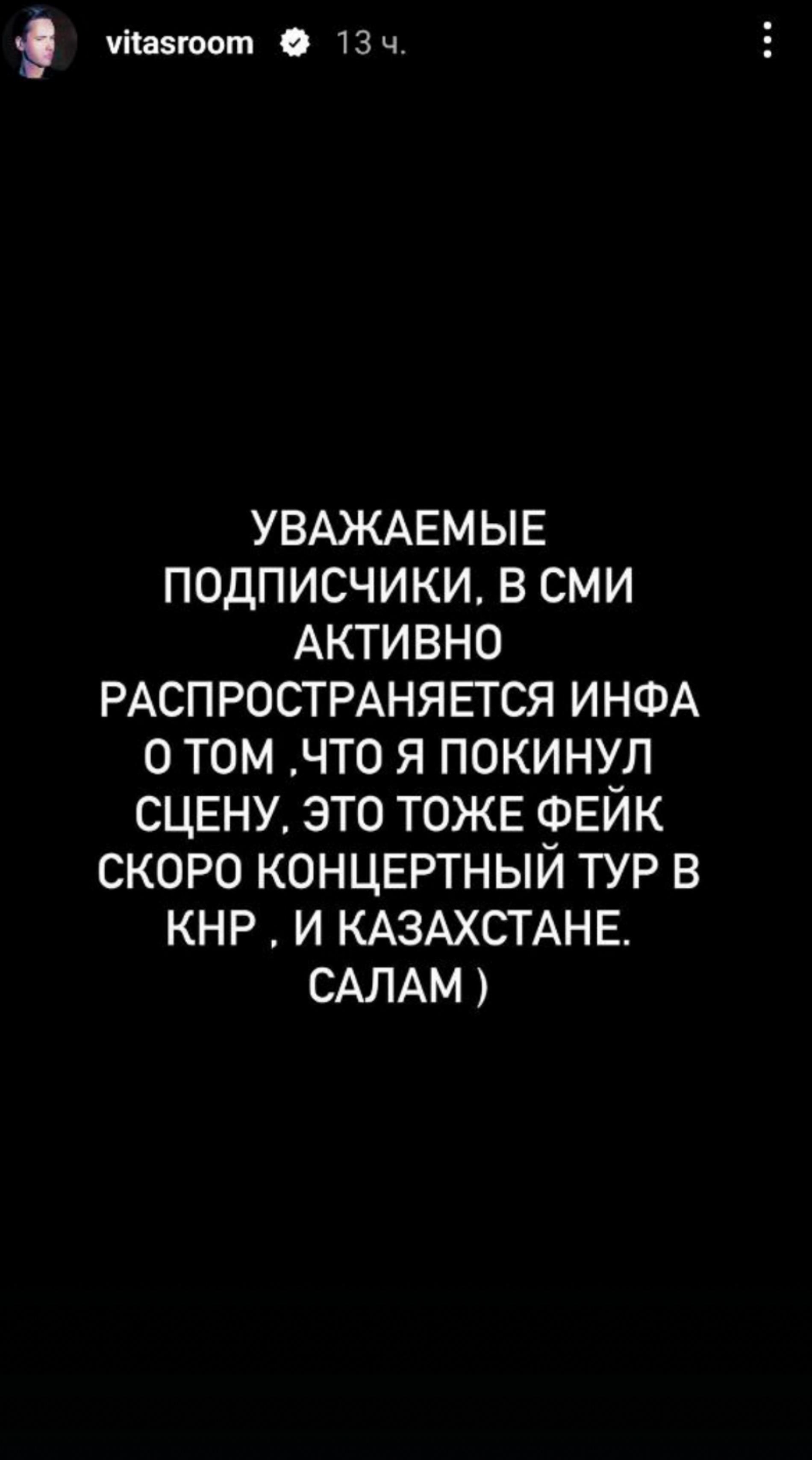 В своем аккаунте в инстаграме* певец также назвал ложной информацию, что он завершил музыкальную карьеру — якобы некоторые СМИ об этом написали. «Это фейк, скоро концертный тур в КНР и Казахстане», — сообщил Витас.