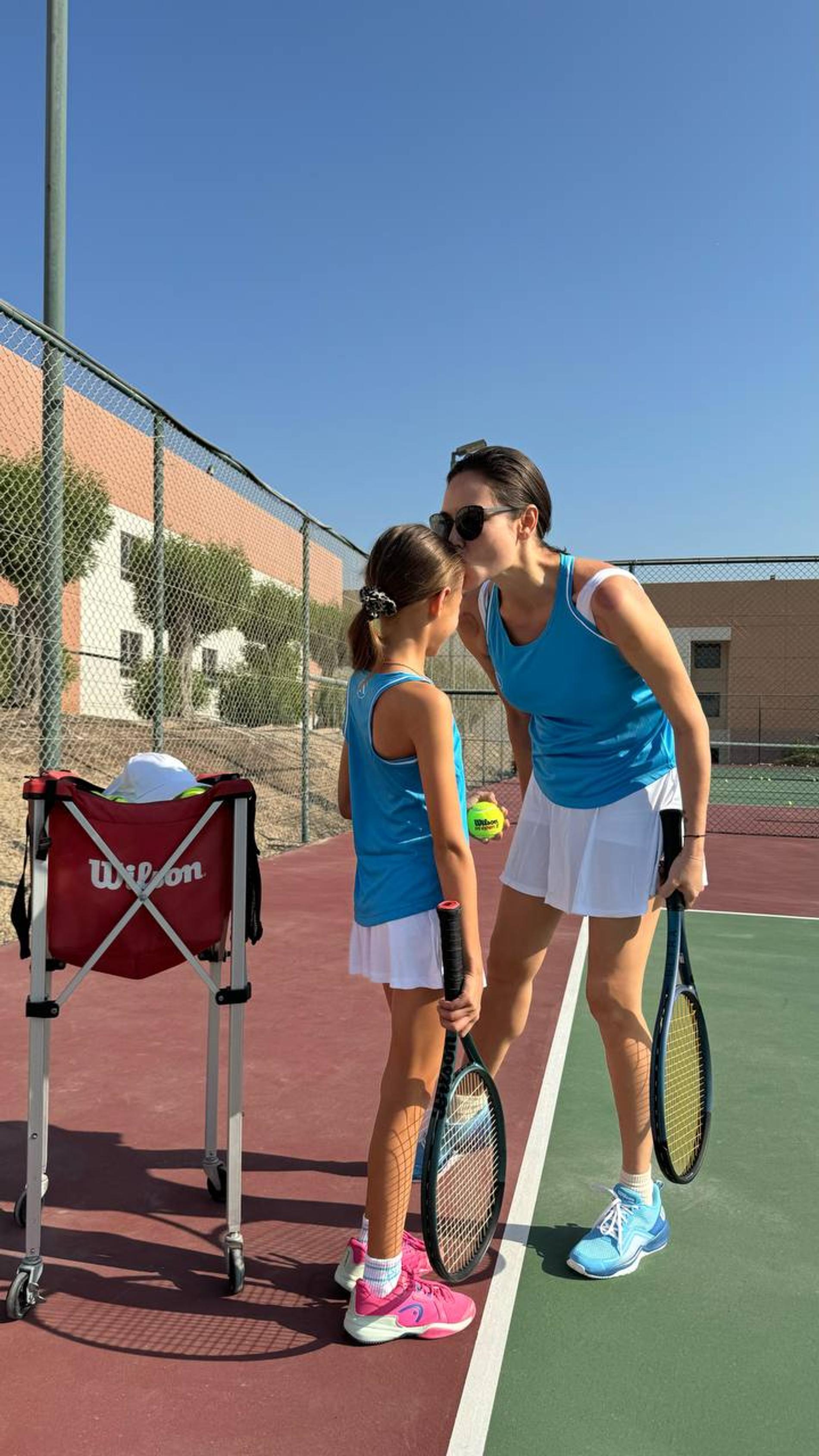 Теперь с разрешения девочки фотографии время от времени появляются в мамином блоге, но все еще без лица. На этот раз звезда опубликовала снимок с теннисного корта — на нем Ляйсан целует 9-летнюю Софию в лоб. Мама и дочь примерили парные образы — голубые майки и белые спортивные юбки. Заметим, что, несмотря на «анонимные» снимки в соцсетях, девочка приходила к папе на работу — в студию его шоу, где попала в кадр на съемках.