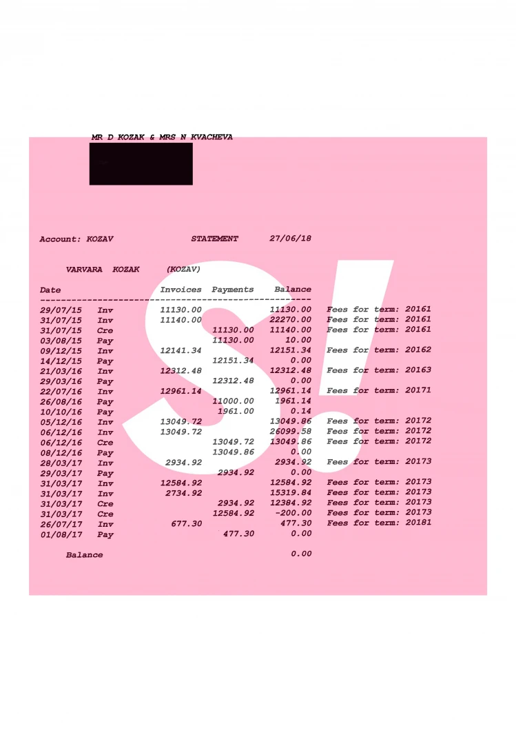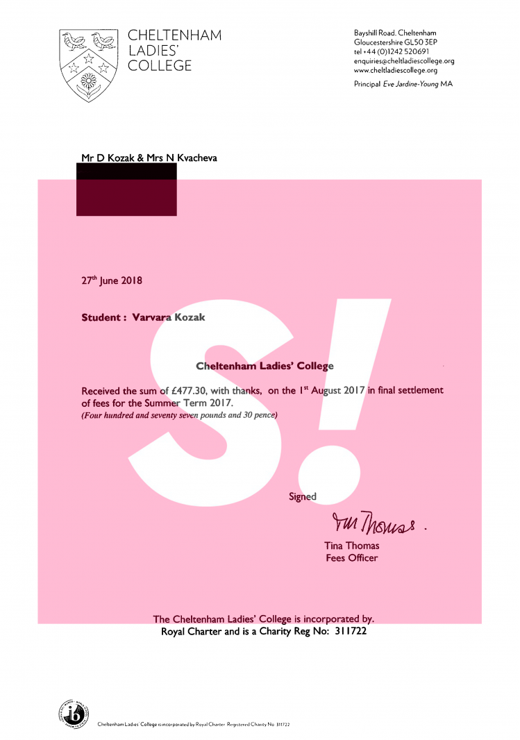 В конце 2014 года вице-премьер Дмитрий Козак опровергал информацию о том, что его дети учатся в Англии: «Никто из известных мне моих детей никогда не жил, не учился и не работал за границей», — сообщил тогда Козак в эфире телеканала «Россия-24». Спустя полгода после этого 14-летняя дочь чиновника Варвара Козак отправилась в британский городок Челтнем получать образование в престижном колледже для юных леди. В распоряжении Super оказалась выписка об оплате 104 716,46 фунта за обучение Варвары Козак в Cheltenham Ladies College. Документ адресован родителям студентки Наталье Квачевой и Дмитрию Козаку.