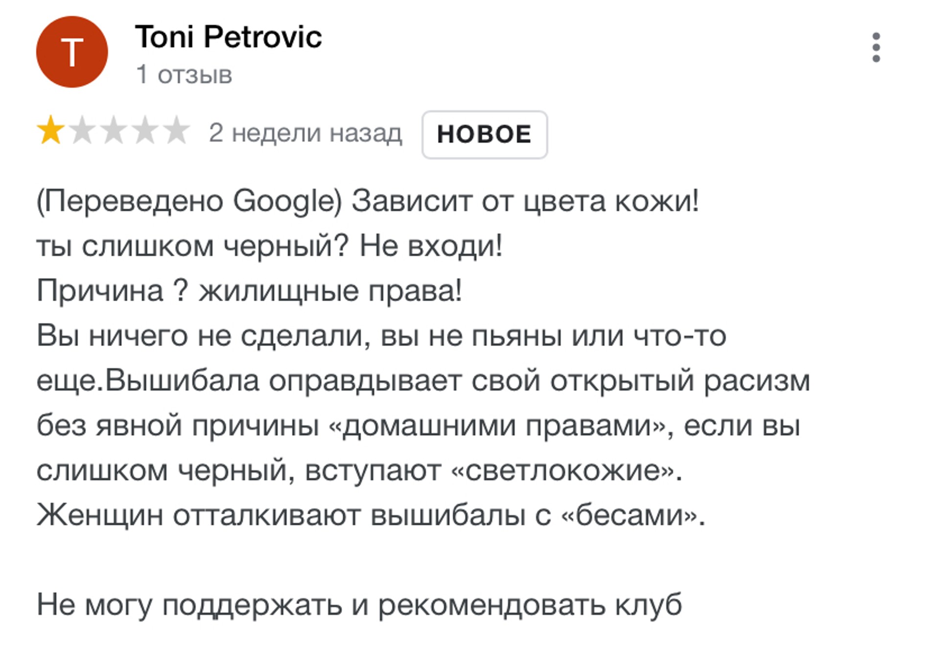 С отзывами у заведения и раньше все было не слава богу. Посетители жаловались не только на грубость охранника в целом, но и на откровенные проявления расизма.
