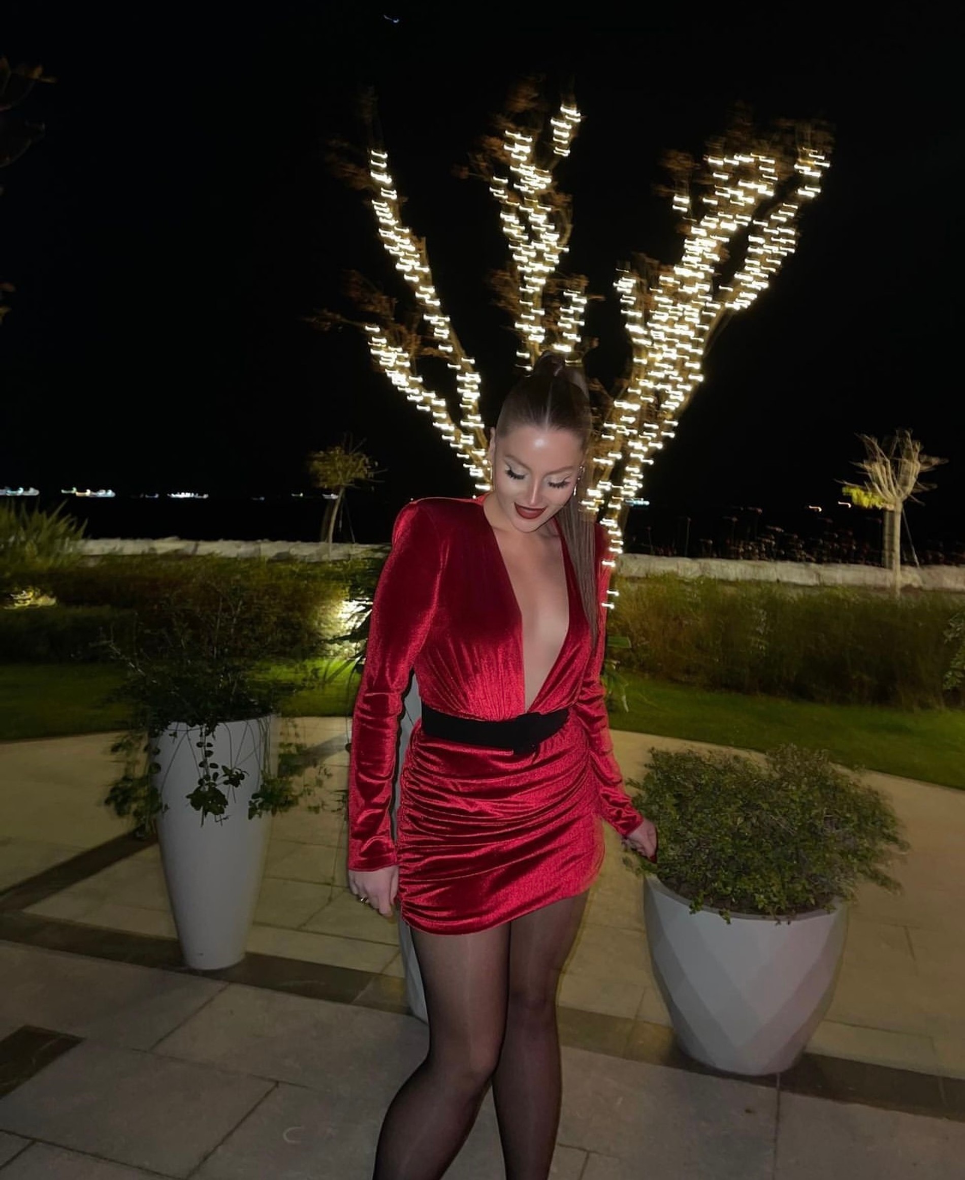 Девушка поделилась в личном блоге снимками в рождественском наряде. Красное бархатное платье мини подчеркнуло постройневшую фигуру Эльчин. А опасную длину актриса дополнила еще роскошным декольте до пояса.