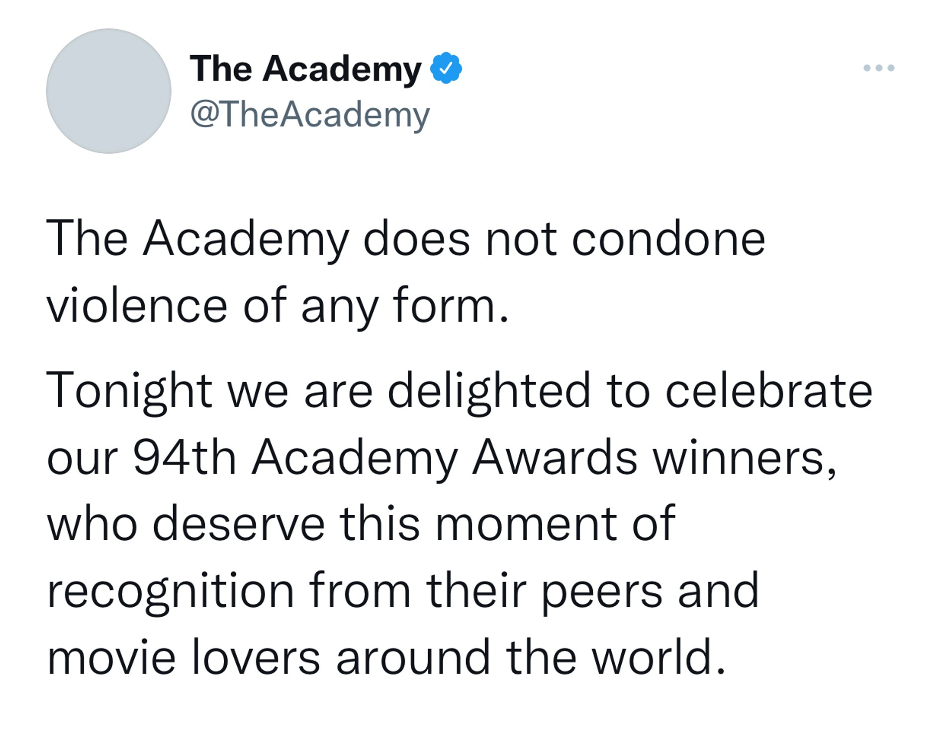 «Академия не одобряет насилие в любой форме. Сегодня вечером мы рады отпраздновать 94-ю годовщину вручения премии «Оскар», которая заслужила этот момент признания со стороны своих современников и любителей кино со всего мира»