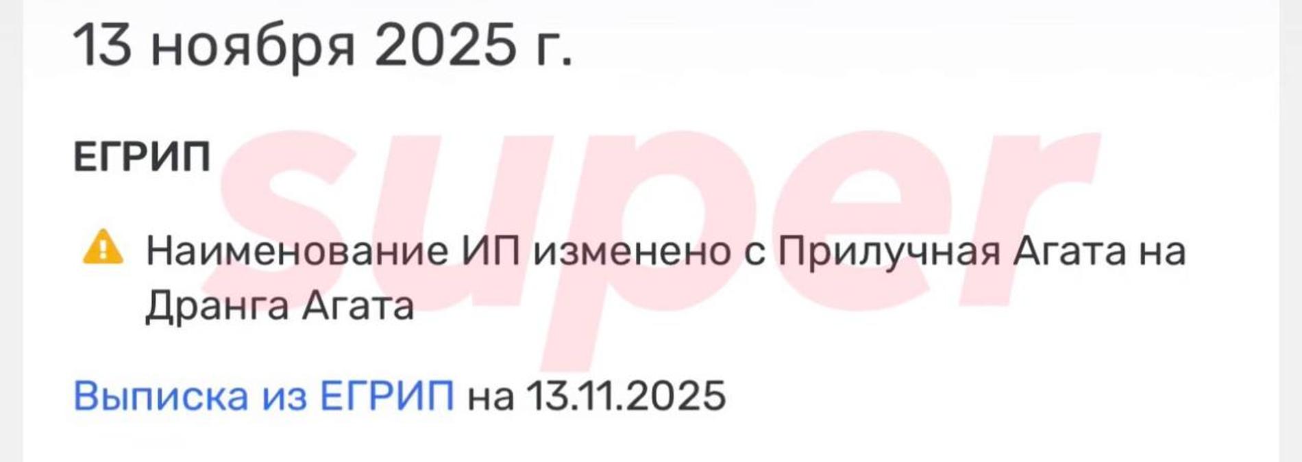 Актриса Агата Муцениеце официально сменила фамилию Прилучная на Дранга. Информация об этом появилась на сайте Rusprofile. Согласно данным сервиса, актриса изменила название своего индивидуального предпринимательства: теперь ИП зарегистрировано как «Дранга Агата» вместо прежнего «Прилучная Агата».